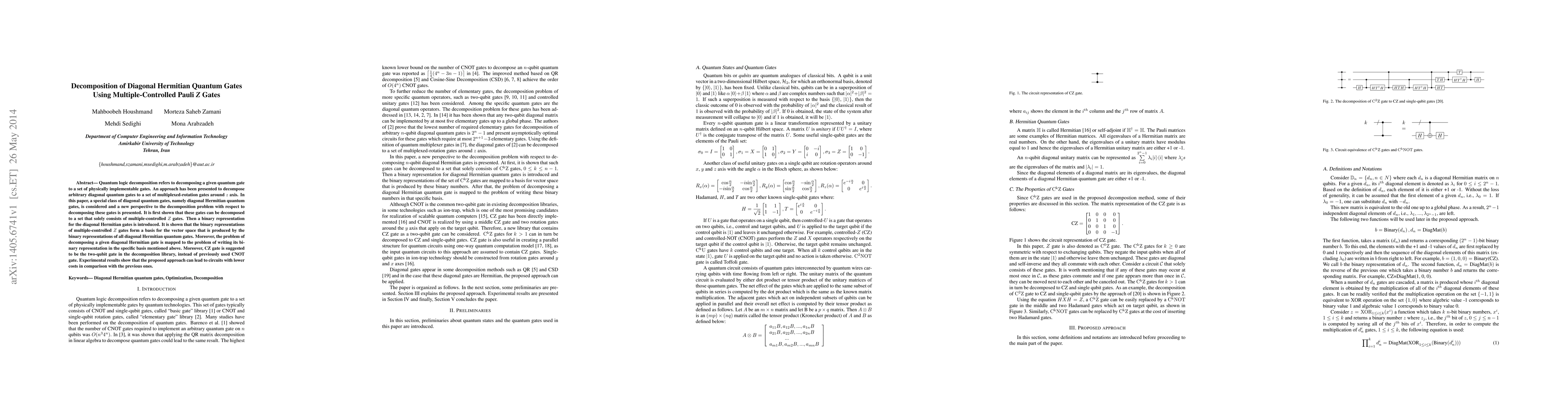 This paper presents a novel approach to decompose diagonal Hermitian quantum gates into multiple-controlled Pauli Z (CZ) gates, introducing a binary representation basis for these gates. The suggested method demonstrates lower circuit cost compared to previous decomposition techniques using CNOT gates.