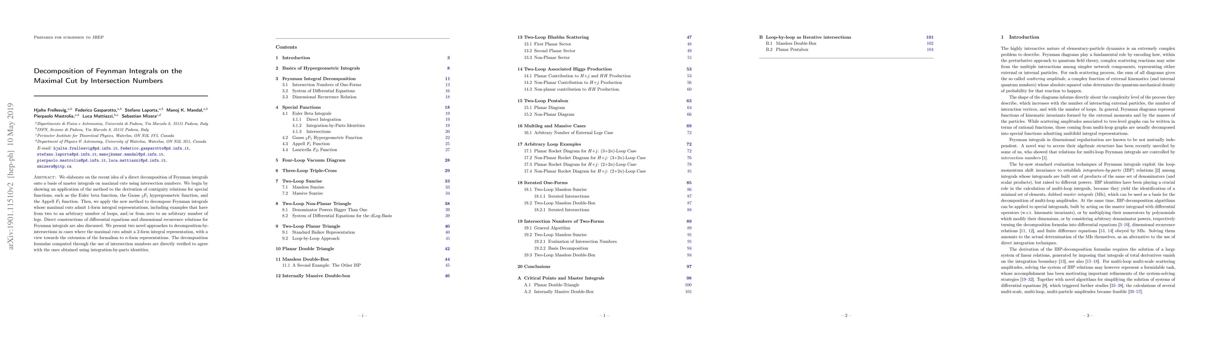 We elaborate on the recent idea of a direct decomposition of Feynman integrals onto a basis of master integrals on maximal cuts using intersection numbers. We begin by showing an application of the method to the derivation of contiguity relations for special functions, such as the Euler beta function, the Gauss ${}_2F_1$ hypergeometric function, and the Appell $F_1$ function. Then, we apply the new method to decompose Feynman integrals whose maximal cuts admit 1-form integral representations, including examples that have from two to an arbitrary number of loops, and/or from zero to an arbitrary number of legs. Direct constructions of differential equations and dimensional recurrence relations for Feynman integrals are also discussed. We present two novel approaches to decomposition-by-intersections in cases where the maximal cuts admit a 2-form integral representation, with a view towards the extension of the formalism to $n$-form representations. The decomposition formulae computed through the use of intersection numbers are directly verified to agree with the ones obtained using integration-by-parts identities.