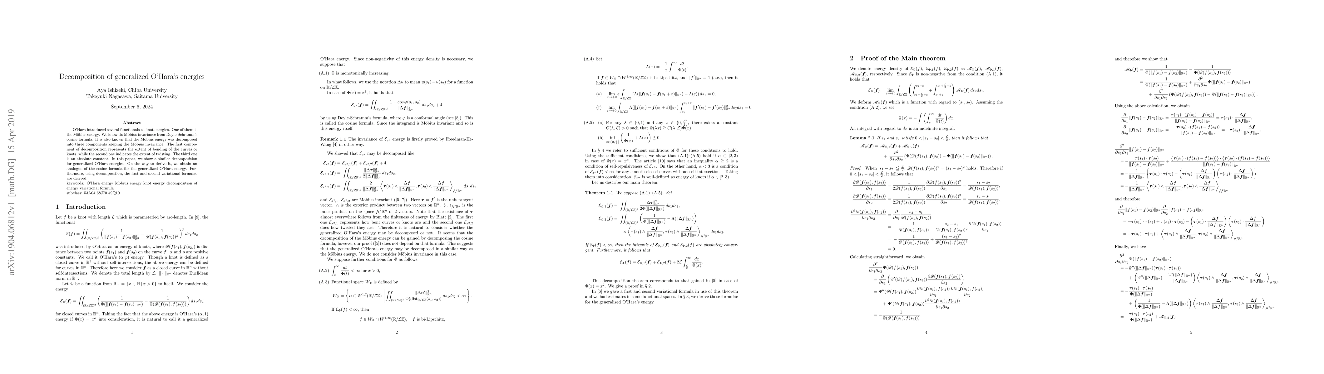 This paper decomposes generalized O'Hara energies into three components, analogous to the Möbius energy, revealing bending, twisting, and an absolute constant. It also derives an analogue of the cosine formula and the first and second variational formulae for these energies.