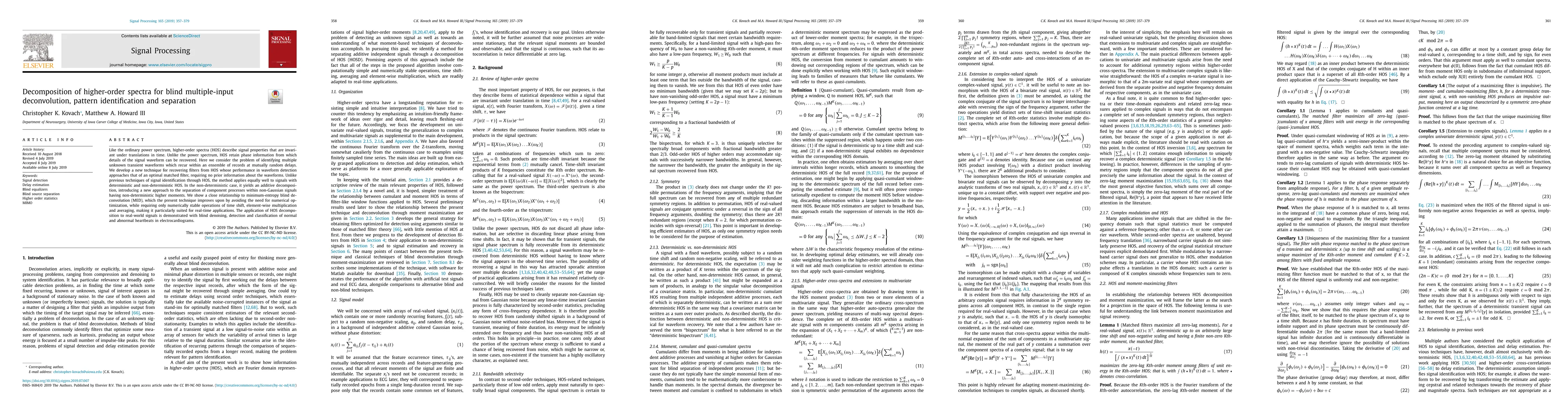 Like the ordinary power spectrum, higher-order spectra (HOS) describe signal properties that are invariant under translations in time. Unlike the power spectrum, HOS retain phase information from which details of the signal waveform can be recovered. Here we consider the problem of identifying multiple unknown transient waveforms which recur within an ensemble of records at mutually random delays. We develop a new technique for recovering filters from HOS whose performance in waveform detection approaches that of an optimal matched filter, requiring no prior information about the waveforms. Unlike previous techniques of signal identification through HOS, the method applies equally well to signals with deterministic and non-deterministic HOS. In the non-deterministic case, it yields an additive decomposition, introducing a new approach to the separation of component processes within non-Gaussian signals having non-deterministic higher moments. We show a close relationship to minimum-entropy blind deconvolution (MED), which the present technique improves upon by avoiding the need for numerical optimization, while requiring only numerically stable operations of time shift, element-wise multiplication and averaging, making it particularly suited for real-time applications. The application of HOS decomposition to real-world signals is demonstrated with blind denoising, detection and classification of normal and abnormal heartbeats in electrocardiograms.