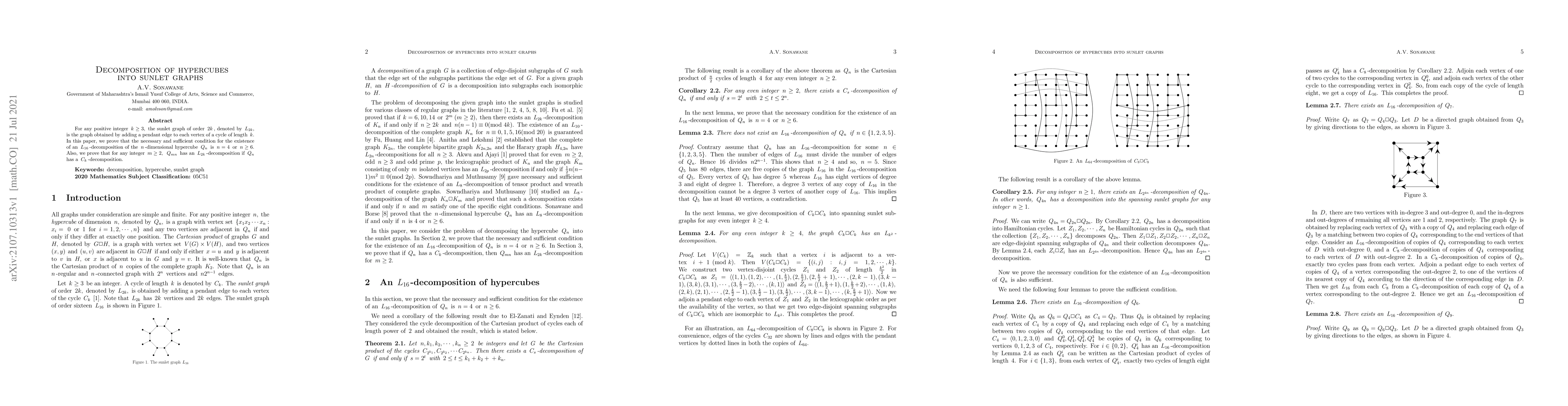 This paper proves that an $L_{16}$-decomposition of an $n$-dimensional hypercube $Q_n$ exists if and only if $n = 4$ or $n geq 6$. It also establishes that for any integer $m geq 2$, $Q_{mn}$ can be decomposed into sunlet graphs $L_{2k}$ if $Q_n$ has a cycle decomposition $C_k$.
