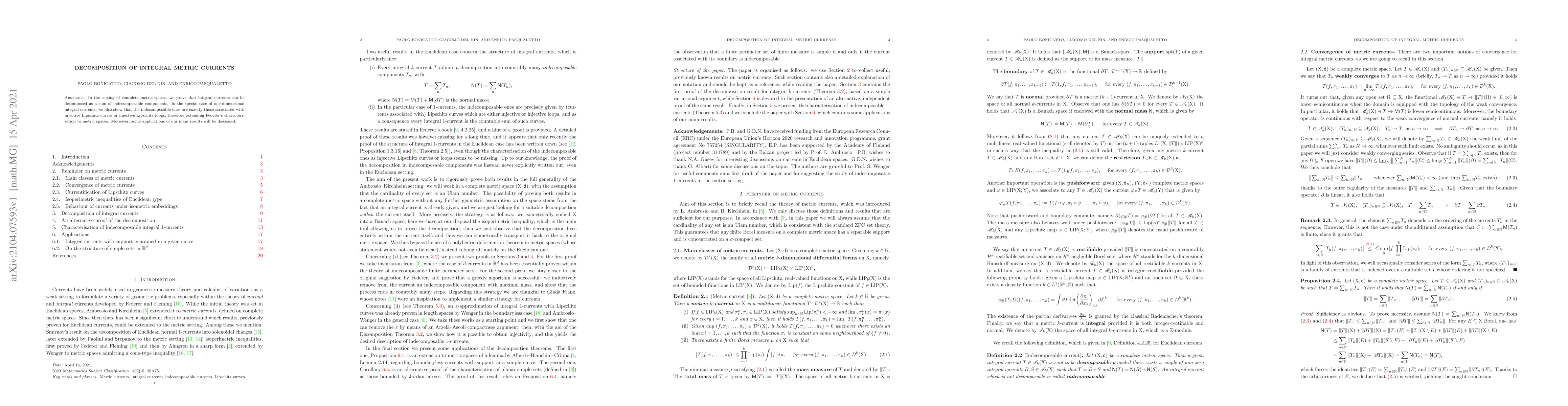 The paper presents a rigorous proof of the decomposition of integral metric currents into indecomposable components, extending Federer's characterization to the setting of complete metric spaces.