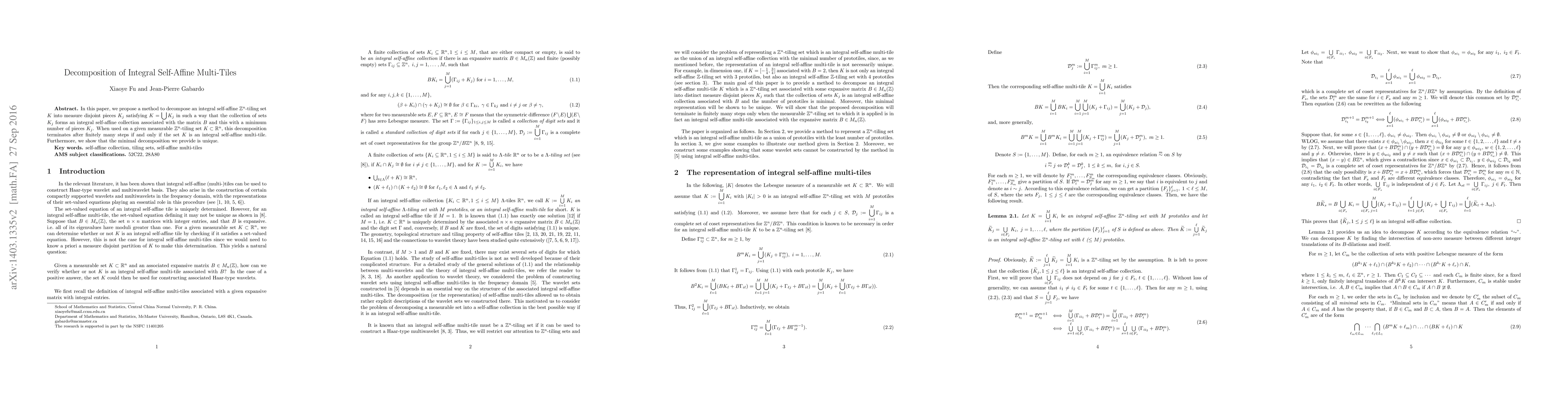This paper introduces a method for decomposing integral self-affine ${\mathbb Z}^n$-tiling sets into a minimal number of measure-disjoint pieces, ensuring the collection forms an integral self-affine collection. The decomposition is unique and terminates in finitely many steps if and only if the original set is an integral self-affine multi-tile.