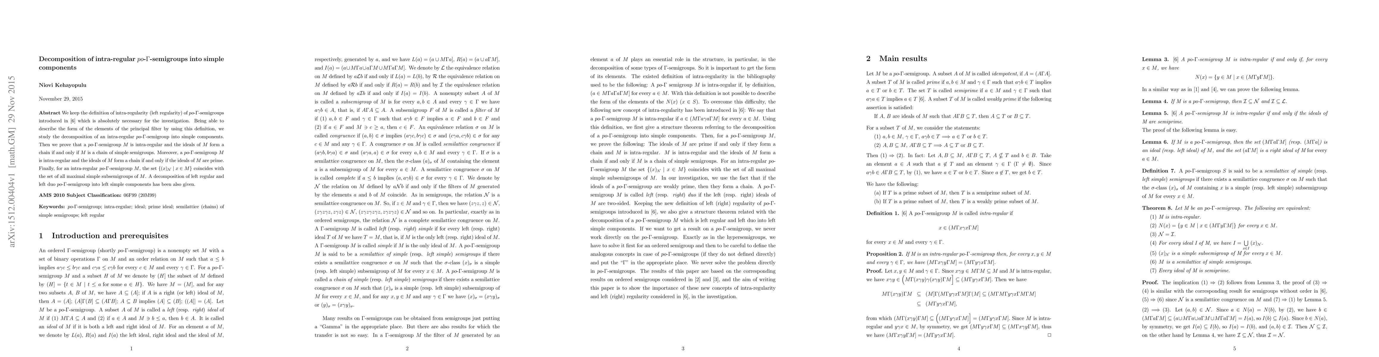 This paper investigates the decomposition of intra-regular $po$-$\Gamma$-semigroups into simple components, proving that such semigroups are chains of simple components if their ideals form a chain. It also shows that the set of principal filters corresponds to maximal simple subsemigroups.
