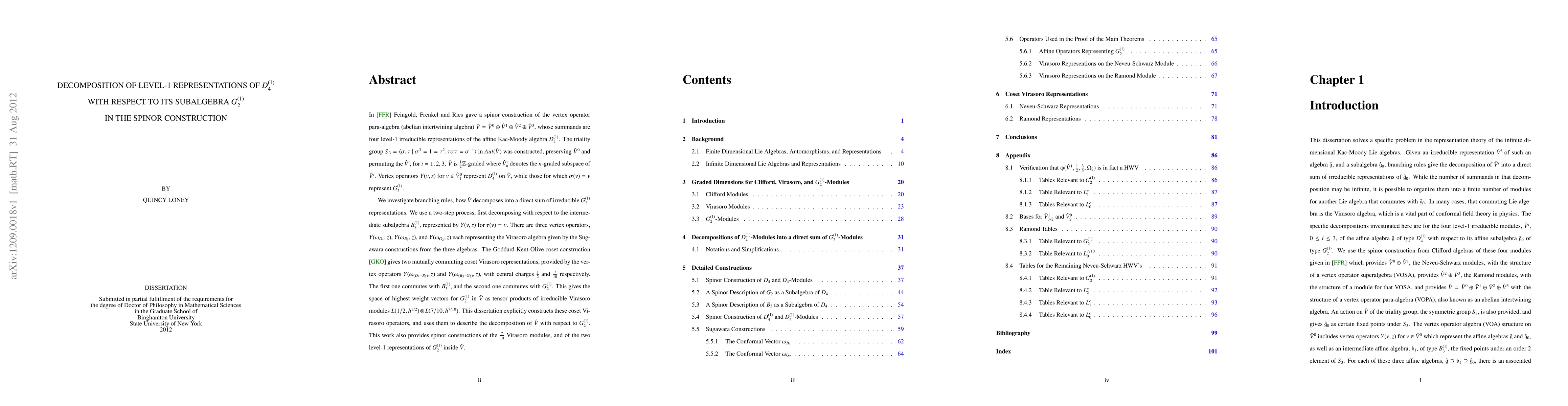 In [FFR] Feingold, Frenkel and Ries gave a spinor construction of the vertex operator para-algebra (abelian intertwining algebra) V = V^0 \oplus V^1 \oplus V^2 \oplus V^3, whose summands are four level-1 irreducible representations of the affine Kac-Moody algebra D_4^(1). The triality group S_3 = < \sigma,\tau | \sigma^3 = 1 = \tau^2, \tau\sigma\tau = \sigma^{-1} > in Aut(V) was constructed, preserving V^0 and permuting the V^i, for i=1,2,3. V is (1/2)Z-graded where V^i_n denotes the n-graded subspace of V^i. Vertex operators Y(v,z) for v in V^0_1 represent D_4^(1) on V, while those for which \sigma(v) = v represent G_2^(1). We investigate branching rules, how V decomposes into a direct sum of irreducible G_2^(1) representations. We use a two-step process, first decomposing with respect to the intermediate subalgebra B_3^(1), represented by Y(v,z) for \tau(v) = v. There are three vertex operators, Y(\omega_{D_4},z), Y(\omega_{B_3},z), and Y(\omega_{G_2},z) each representing the Virasoro algebra given by the Sugawara constructions from the three algebras. The Goddard-Kent-Olive coset construction [GKO] gives two mutually commuting coset Virasoro representations, provided by the vertex operators Y(\omega_{D_4}-\omega_{B_3},z) and Y(\omega_{B_3}-\omega_{G_2},z), with central charges 1/2 and 7/10, respectively. The first one commutes with B_3^(1), and the second one commutes with G_2^(1). This gives the space of highest weight vectors for G_2^(1) in V as tensor products of irreducible Virasoro modules L(1/2,h^{1/2}) \otimes L(7/10,h^{7/10}). This dissertation explicitly constructs these coset Virasoro operators, and uses them to describe the decomposition of V with respect to G_2^(1). This work also provides spinor constructions of the 7/10 Virasoro modules, and of the two level-1 representations of G_2^(1) inside V.