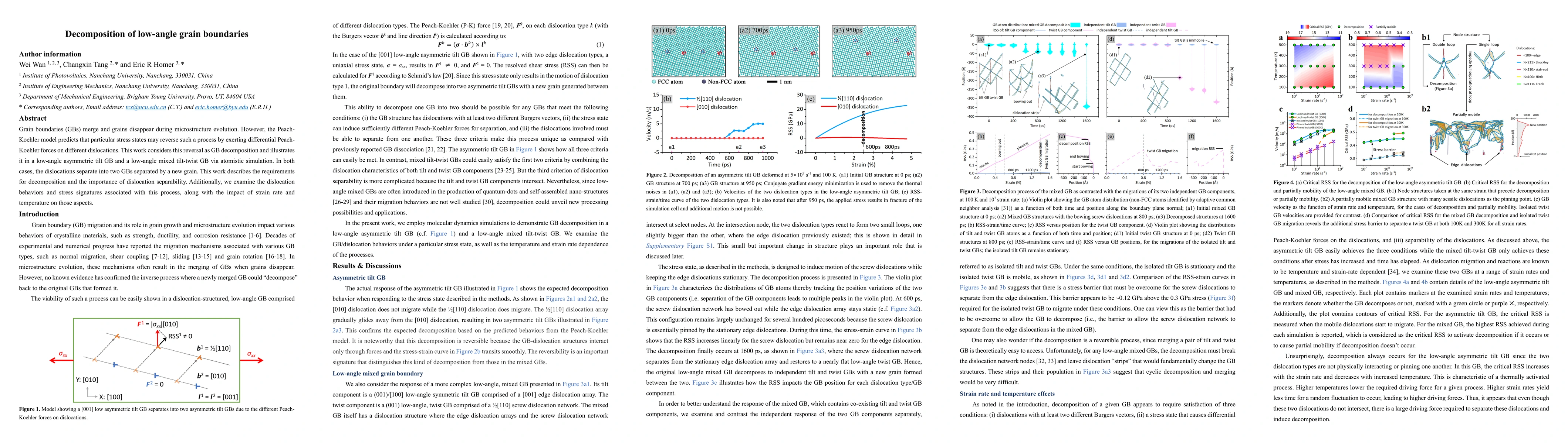 Grain boundaries (GBs) merge and grains disappear during microstructure evolution. However, the Peach-Koehler model predicts that particular stress states may reverse such a process by exerting differential Peach-Koehler forces on different dislocations. This work considers this reversal as GB decomposition and illustrates it in a low-angle asymmetric tilt GB and a low-angle mixed tilt-twist GB via atomistic simulation. In both cases, the dislocations separate into two GBs separated by a new grain. This work describes the requirements for decomposition and the importance of dislocation separability. Additionally, we examine the dislocation behaviors and stress signatures associated with this process, along with the impact of strain rate and temperature on those aspects.