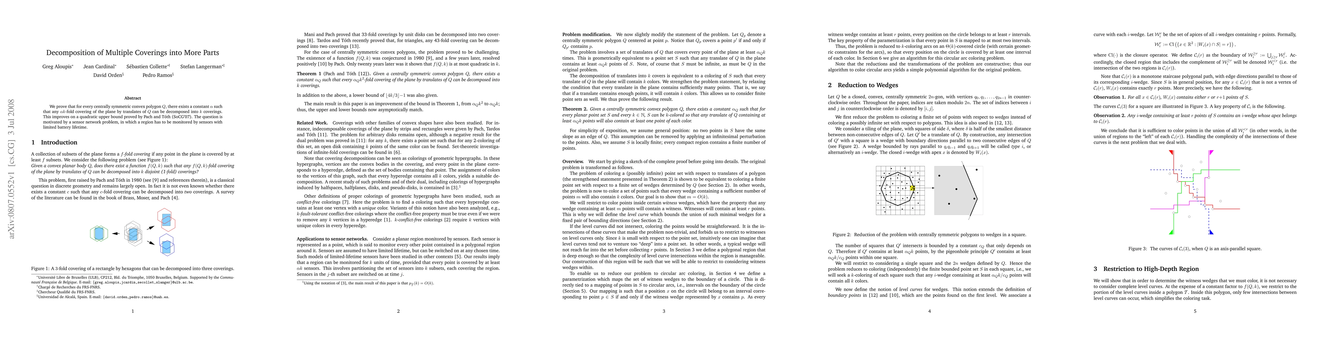 This paper demonstrates that any alpha*k-fold covering of the plane by translates of a centrally symmetric convex polygon Q can be decomposed into k coverings, improving upon a previous quadratic upper bound. This result addresses a sensor network problem, where regions need to be monitored by sensors with limited battery life.