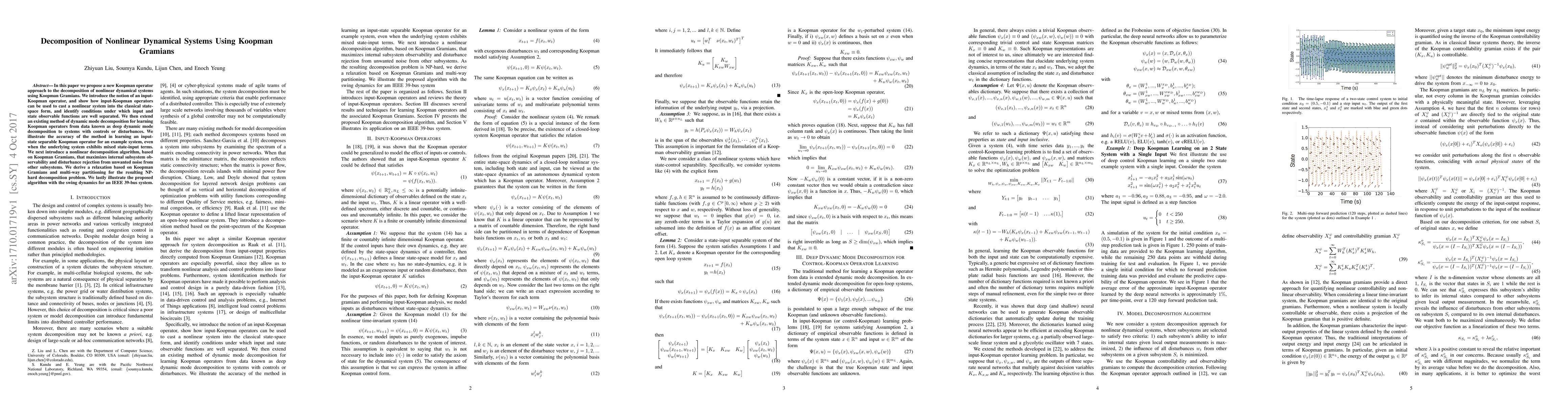 This paper introduces a novel Koopman operator approach for decomposing nonlinear dynamical systems using Koopman Gramians, proposing an input-Koopman operator to cast nonlinear systems into classical state-space form and extending dynamic mode decomposition for systems with controls or disturbances. The method is demonstrated through a nonlinear decomposition algorithm that maximizes subsystem observability and disturbance rejection, illustrated with swing dynamics in an IEEE 39-bus system.