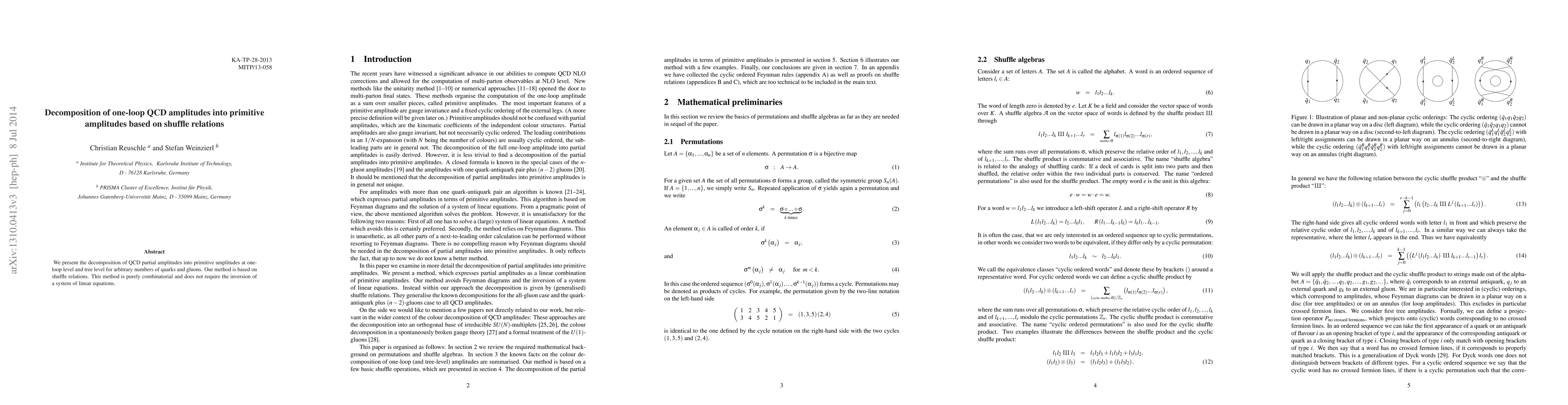 Summary: This paper decomposes one-loop QCD amplitudes into primitive amplitudes using shuffle relations, offering a combinatorial approach that avoids the inversion of linear equations, applicable to any number of quarks and gluons.