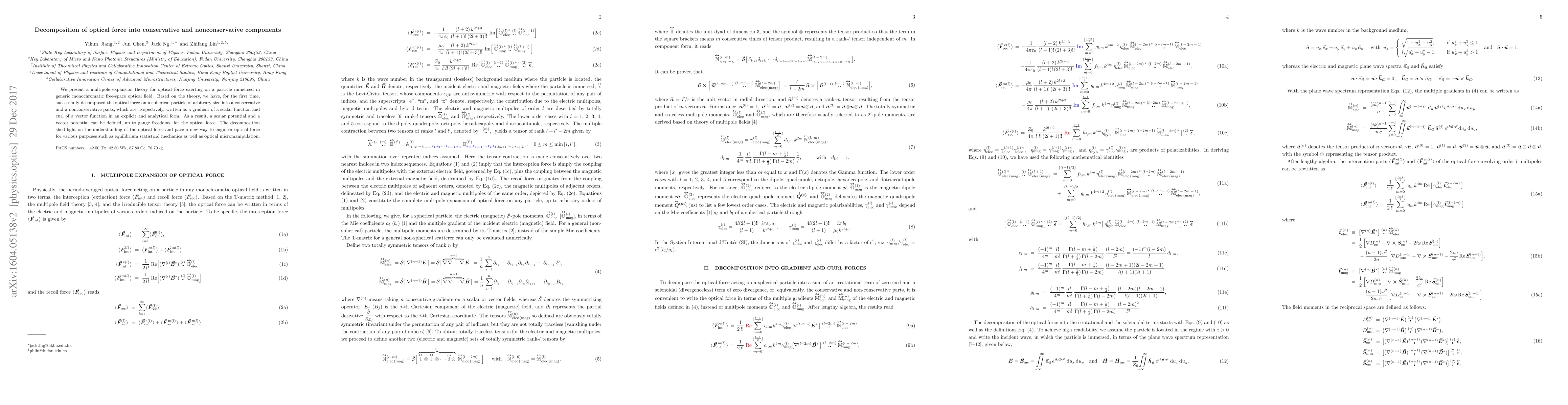 This paper introduces a multipole expansion theory to decompose optical force on a particle in a free-space optical field into conservative and nonconservative components. The decomposition provides explicit, analytical forms for these components, enabling the definition of scalar and vector potentials, which enhances understanding and application in optical micromanipulation and statistical mechanics.