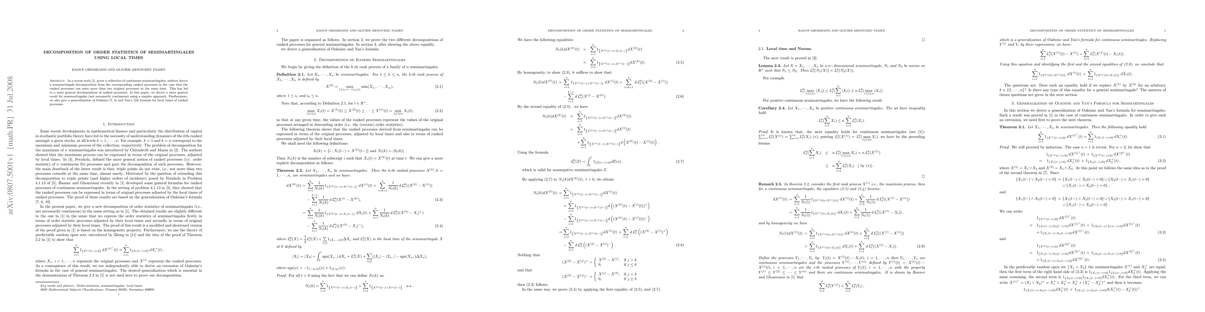 In a recent work \cite{BG}, given a collection of continuous semimartingales, authors derive a semimartingale decomposition from the corresponding ranked processes in the case that the ranked processes can meet more than two original processes at the same time. This has led to a more general decomposition of ranked processes. In this paper, we derive a more general result for semimartingales (not necessarily continuous) using a simpler approach. Furthermore, we also give a generalization of Ouknine \cite{O1, O2} and Yan's \cite{Y1} formula for local times of ranked processes
