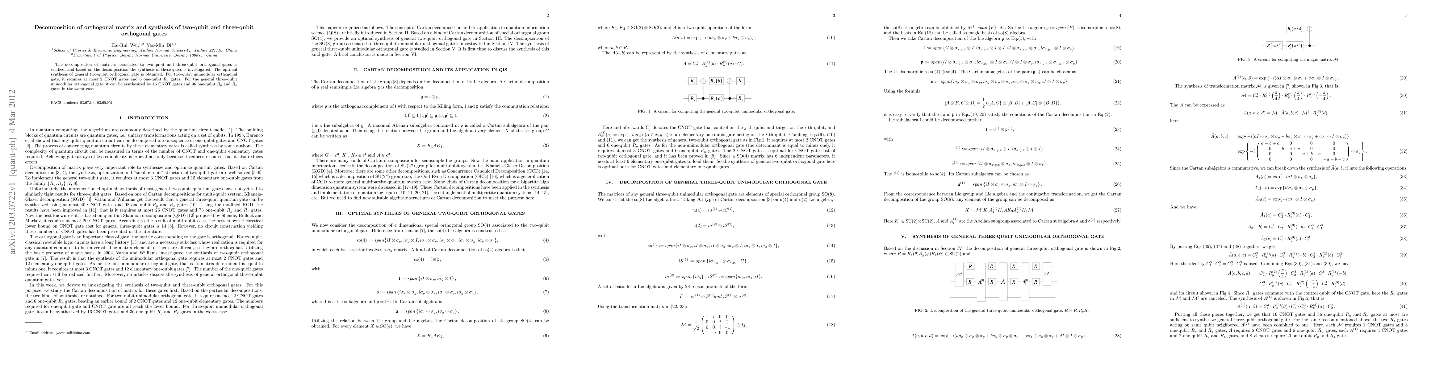 This paper investigates the decomposition and synthesis of orthogonal gates for two-qubit and three-qubit systems, achieving optimal synthesis for two-qubit gates using at most 2 CNOT and 6 one-qubit Ry gates. For three-qubit gates, the worst-case synthesis requires 16 CNOT and 36 one-qubit Ry and Rz gates.