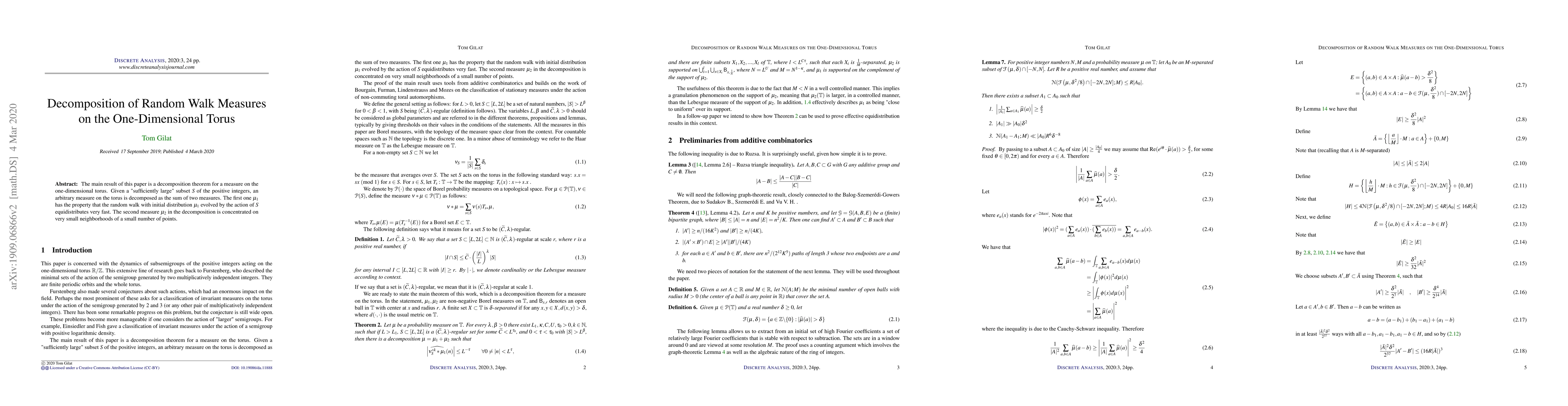 A research paper decomposes measures on a 1D torus into two parts: one that equidistributes random walks quickly and another concentrated around specific points.
