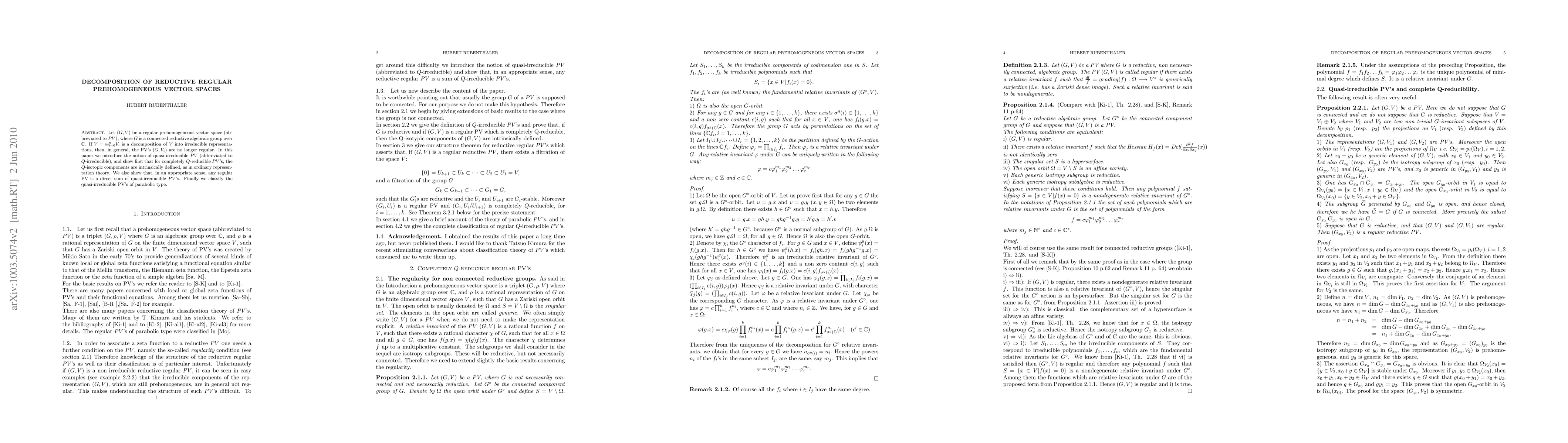 Let (G,V) be a regular prehomogeneous vector space (abbreviated to PV), where G is a connected reductive algebraic group over C. If $V= \oplus_{i=0}^{n}V_{i}$ is a decomposition of V into irreducible representations, then, in general, the PV's $(G,V_{i})$ are no longer regular. In this paper we introduce the notion of quasi-irreducible PV (abbreviated to Q-irreducible), and show first that for completely Q-reducible PV's, the Q-isotopic components are intrinsically defined, as in ordinary representation theory. We also show that, in an appropriate sense, any regular PV is a direct sum of quasi-irreducible PV's. Finally we classify the quasi-irreducible PV's of parabolic type.