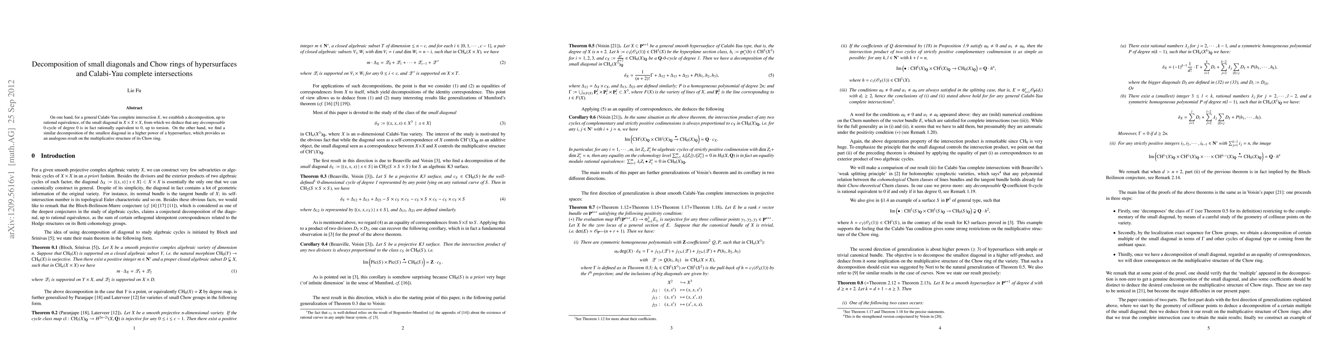 On one hand, for a general Calabi-Yau complete intersection X, we establish a decomposition, up to rational equivalence, of the small diagonal in X^3, from which we deduce that any decomposable 0-cycle of degree 0 is in fact rationally equivalent to 0, up to torsion. On the other hand, we find a similar decomposition of the smallest diagonal in a higher power of a hypersurface, which provides us an analogous result on the multiplicative structure of its Chow ring.