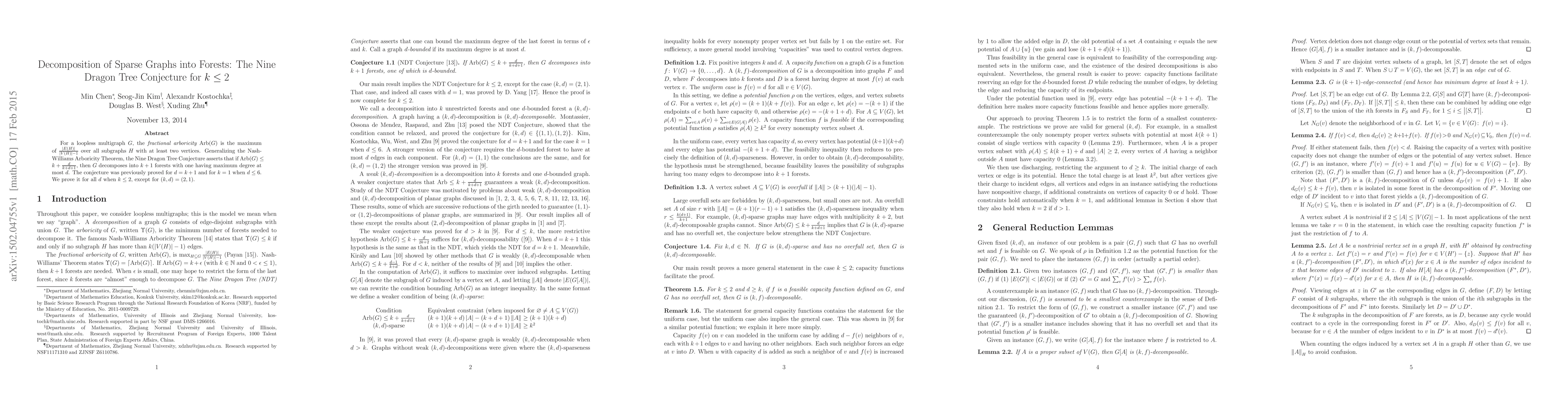 For a loopless multigraph $G$, the fractional arboricity $Arb(G)$ is the maximum of $\frac{|E(H)|}{|V(H)|-1}$ over all subgraphs $H$ with at least two vertices. Generalizing the Nash-Williams Arboricity Theorem, the Nine Dragon Tree Conjecture asserts that if $Arb(G)\le k+\frac{d}{k+d+1}$, then $G$ decomposes into $k+1$ forests with one having maximum degree at most $d$. The conjecture was previously proved for $d=k+1$ and for $k=1$ when $d \le 6$. We prove it for all $d$ when $k \le 2$, except for $(k,d)=(2,1)$.