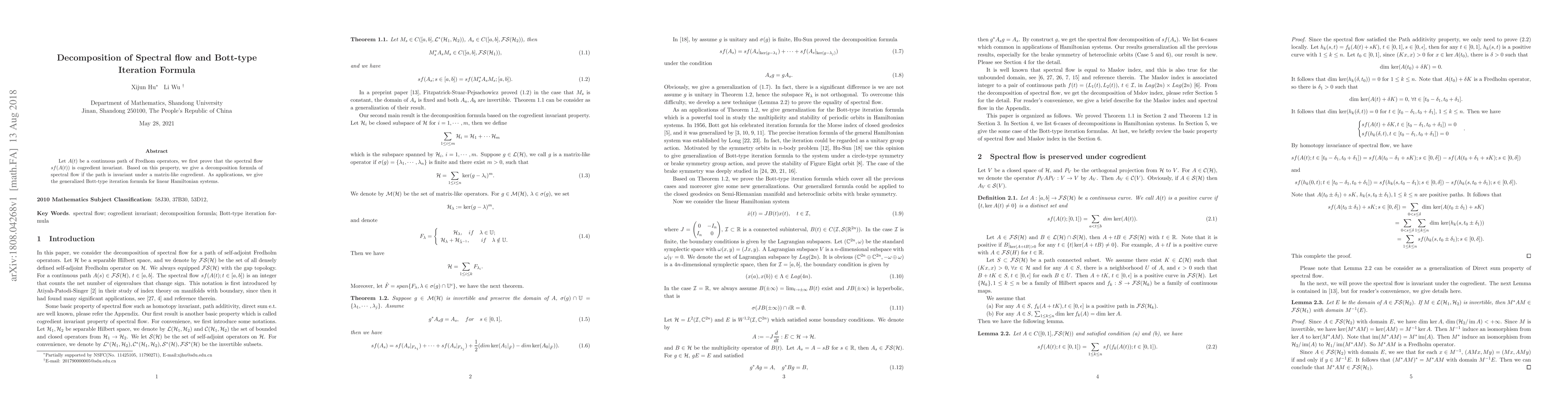 This paper proves that the spectral flow $sf(A(t))$ is cogredient invariant and provides a decomposition formula for spectral flow under matrix-like cogredient invariance. It also applies these results to derive a generalized Bott-type iteration formula for linear Hamiltonian systems.