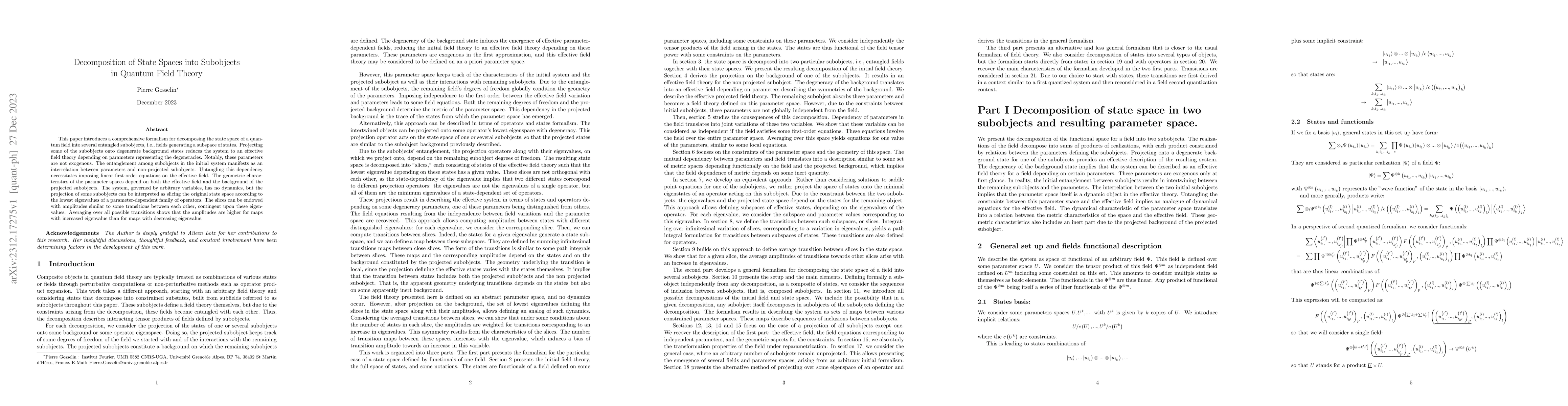 This paper introduces a comprehensive formalism for decomposing the state space of a quantum field into several entangled subobjects, i.e., fields generating a subspace of states. Projecting some of the subobjects onto degenerate background states reduces the system to an effective field theory depending on parameters representing the degeneracies. Notably, these parameters are not exogenous. The entanglement among subobjects in the initial system manifests as an interrelation between parameters and non-projected subobjects. Untangling this dependency necessitates imposing linear first-order equations on the effective field. The geometric characteristics of the parameter spaces depend on both the effective field and the background of the projected subobjects. The system, governed by arbitrary variables, has no dynamics, but the projection of some subobjects can be interpreted as slicing the original state space according to the lowest eigenvalues of a parameter-dependent family of operators. The slices can be endowed with amplitudes similar to some transitions between each other, contingent upon these eigenvalues. Averaging over all possible transitions shows that the amplitudes are higher for maps with increased eigenvalue than for maps with decreasing eigenvalue.