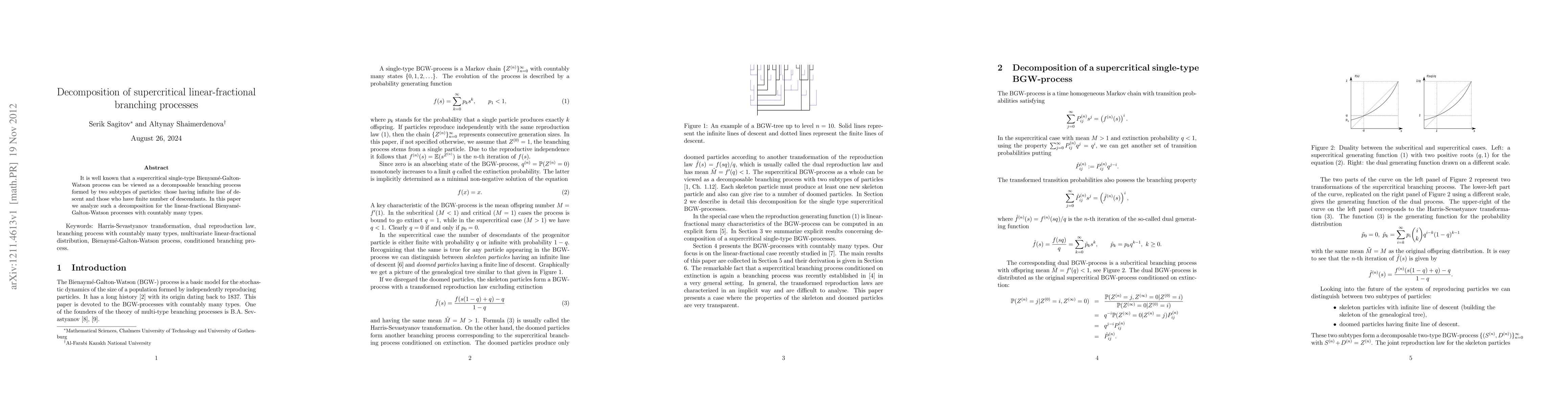 This paper explores the decomposition of supercritical linear-fractional Bienyamé-Galton-Watson processes into two subtypes: particles with infinite lineage and those with a finite number of descendants. It extends the decomposition analysis to branching processes with countably many types.