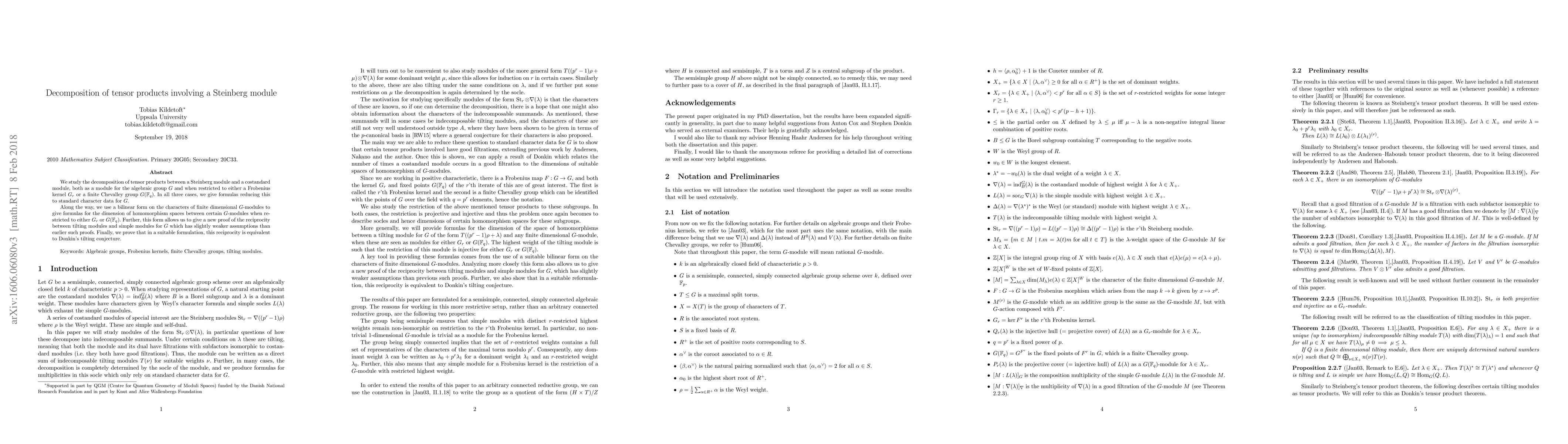 We study the decomposition of tensor products between a Steinberg module and a costandard module, both as a module for the algebraic group $G$ and when restricted to either a Frobenius kernel $G_r$ or a finite Chevalley group $G(\mathbb{F}_q)$. In all three cases, we give formulas reducing this to standard character data for $G$. Along the way, we define a bilinear form on the characters of finite dimensional $G$-modules and use this to give formulas for the dimension of homomorphism spaces between certain $G$-modules when restricted to either $G_r$ or $G(\mathbb{F}_q)$. Further, this form allows us to give a new proof of the reciprocity between tilting modules and simple modules for $G$ which has slightly weaker assumptions than earlier such proofs. Finally, we prove that in a suitable formulation, this reciprocity is equivalent to Donkin's tilting conjecture.