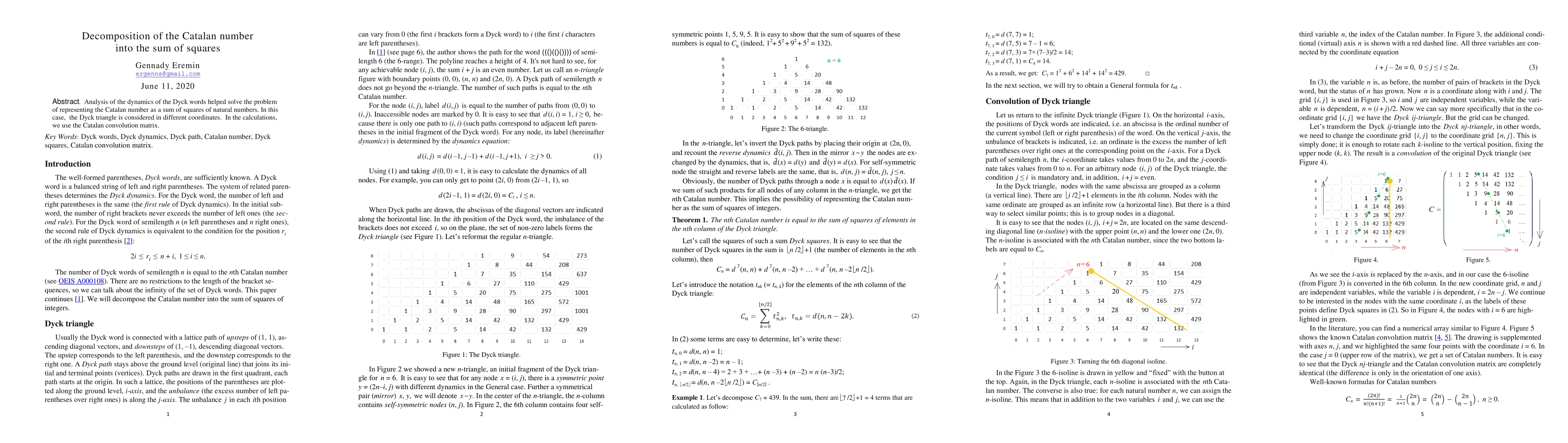 Researchers used a Dyck triangle coordinate system to decompose the Catalan number into a sum of squares, solving a long-standing problem in combinatorics. The study leverages the Catalan convolution matrix to achieve this breakthrough.