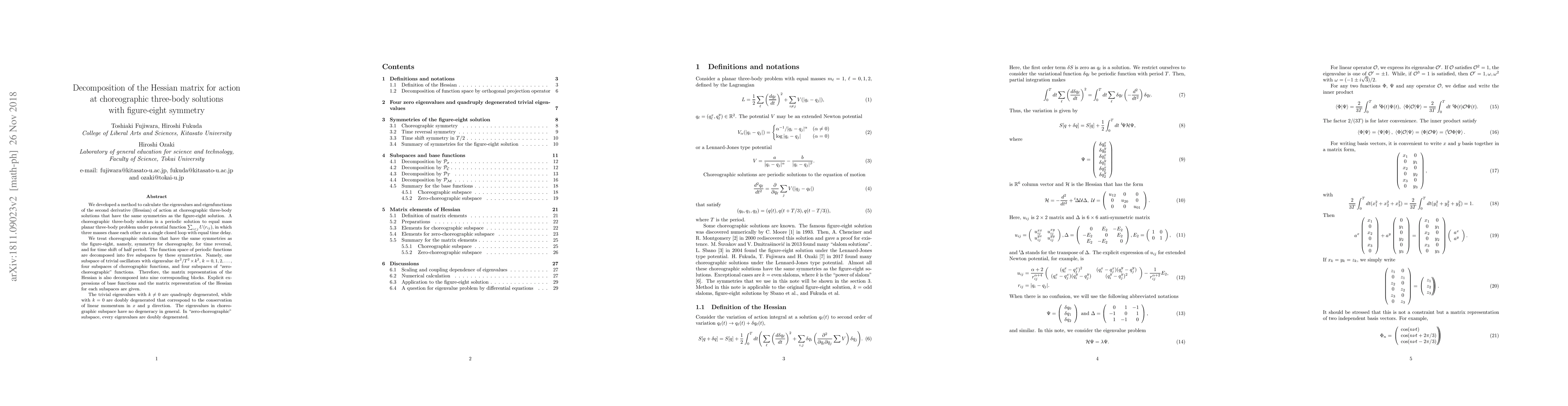 This paper develops a method to decompose the Hessian matrix of action for choreographic three-body solutions with figure-eight symmetry into nine blocks corresponding to five subspaces of periodic functions. The trivial oscillators and "zero-choreographic" functions exhibit specific degeneracy patterns in their eigenvalues.