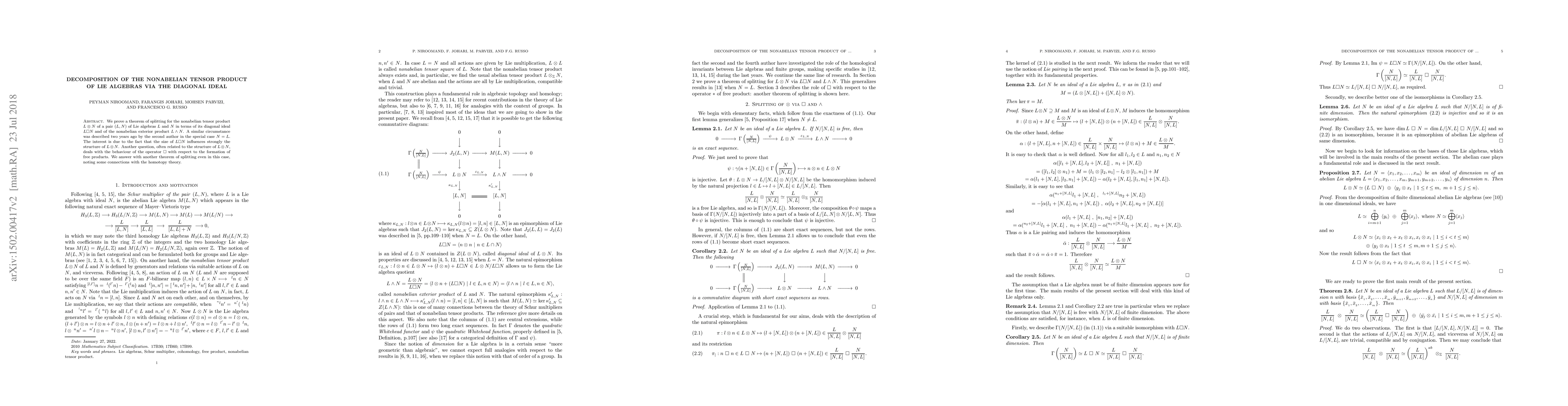 We prove a theorem of splitting for the nonabelian tensor product $L \otimes N$ of a pair $(L,N)$ of Lie algebras $L$ and $N$ in terms of its diagonal ideal $L \square N$ and of the nonabelian exterior product $L \wedge N$. A similar circumstance was described two years ago by the second author in the special case $N=L$. The interest is due to the fact that the size of $L \square N$ influences strongly the structure of $L \otimes N$. Another question, often related to the structure of $L \otimes N$, deals with the behaviour of the operator $\square$ with respect to the formation of free products. We answer with another theorem of splitting even in this case, noting some connections with the homotopy theory.