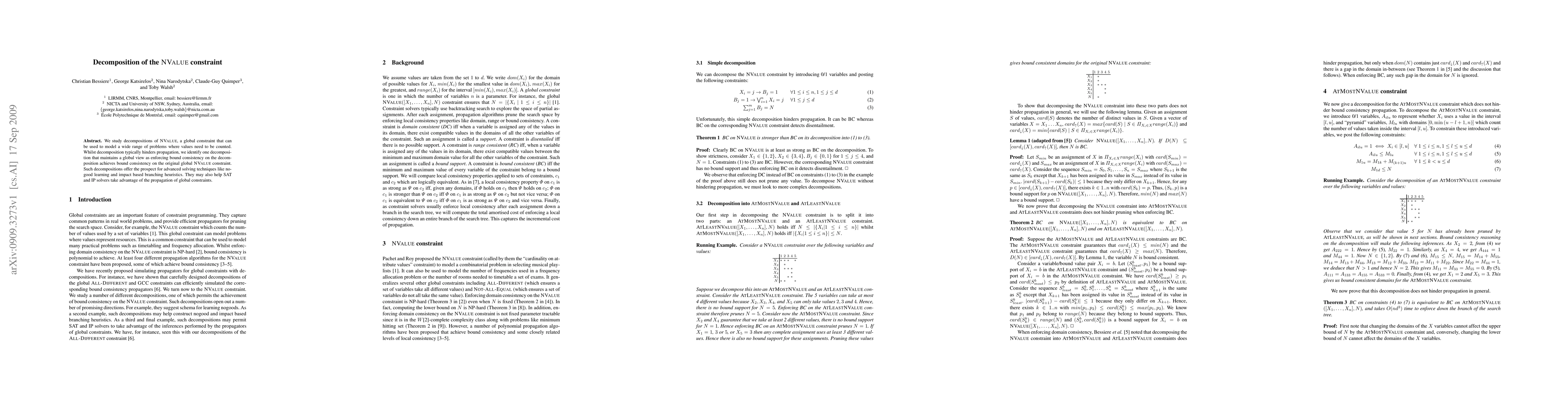 We study decompositions of NVALUE, a global constraint that can be used to model a wide range of problems where values need to be counted. Whilst decomposition typically hinders propagation, we identify one decomposition that maintains a global view as enforcing bound consistency on the decomposition achieves bound consistency on the original global NVALUE constraint. Such decompositions offer the prospect for advanced solving techniques like nogood learning and impact based branching heuristics. They may also help SAT and IP solvers take advantage of the propagation of global constraints.