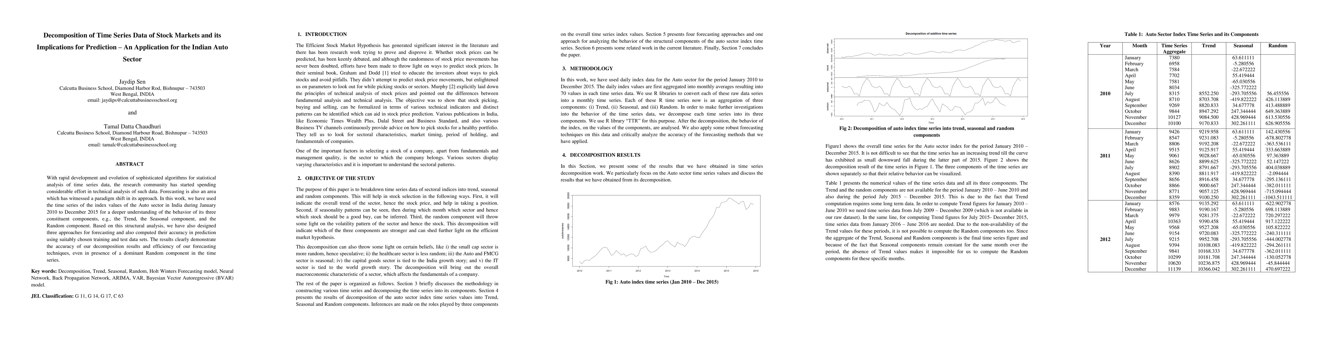 With the rapid development and evolution of sophisticated algorithms for statistical analysis of time series data, the research community has started spending considerable effort in technical analysis of such data. Forecasting is also an area which has witnessed a paradigm shift in its approach. In this work, we have used the time series of the index values of the Auto sector in India during January 2010 to December 2015 for a deeper understanding of the behavior of its three constituent components, e.g., the Trend, the Seasonal component, and the Random component. Based on this structural analysis, we have also designed three approaches for forecasting and also computed their accuracy in prediction using suitably chosen training and test data sets. The results clearly demonstrate the accuracy of our decomposition results and efficiency of our forecasting techniques, even in presence of a dominant Random component in the time series.