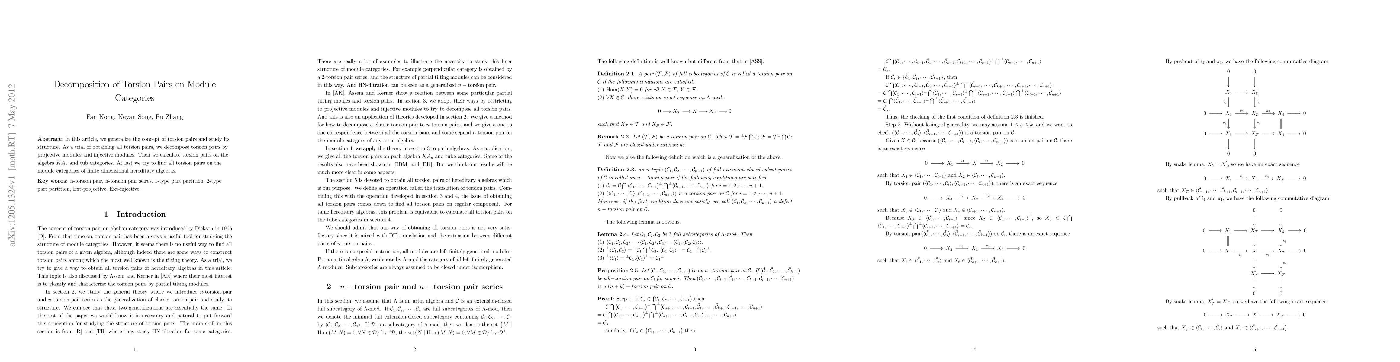This paper generalizes the concept of torsion pairs and decomposes them using projective and injective modules. It calculates torsion pairs for KAn and tube categories and aims to find all torsion pairs in module categories of finite-dimensional hereditary algebras.