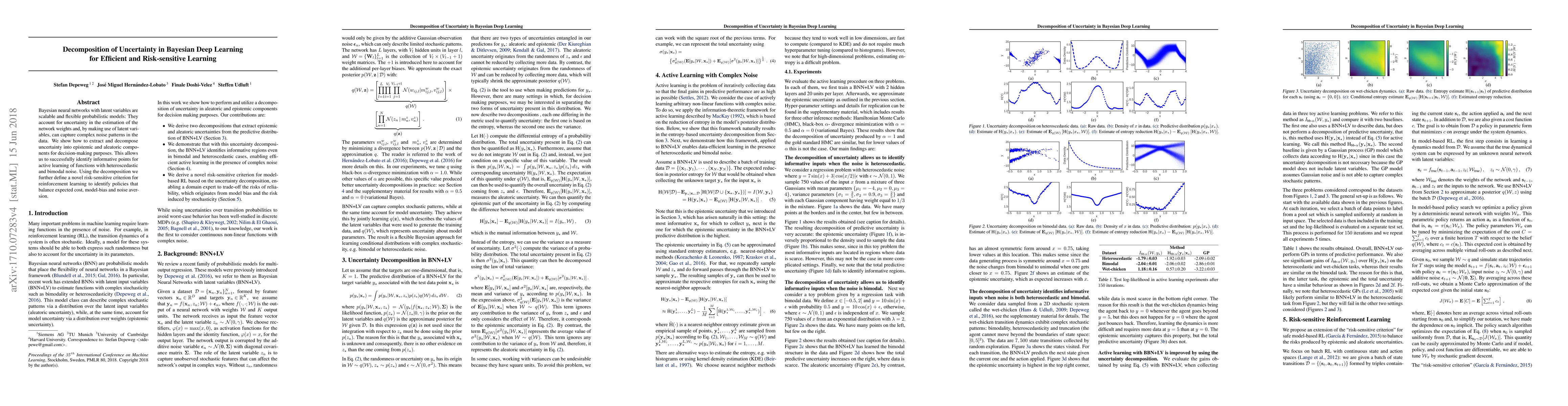 Bayesian neural networks with latent variables are scalable and flexible probabilistic models: They account for uncertainty in the estimation of the network weights and, by making use of latent variables, can capture complex noise patterns in the data. We show how to extract and decompose uncertainty into epistemic and aleatoric components for decision-making purposes. This allows us to successfully identify informative points for active learning of functions with heteroscedastic and bimodal noise. Using the decomposition we further define a novel risk-sensitive criterion for reinforcement learning to identify policies that balance expected cost, model-bias and noise aversion.