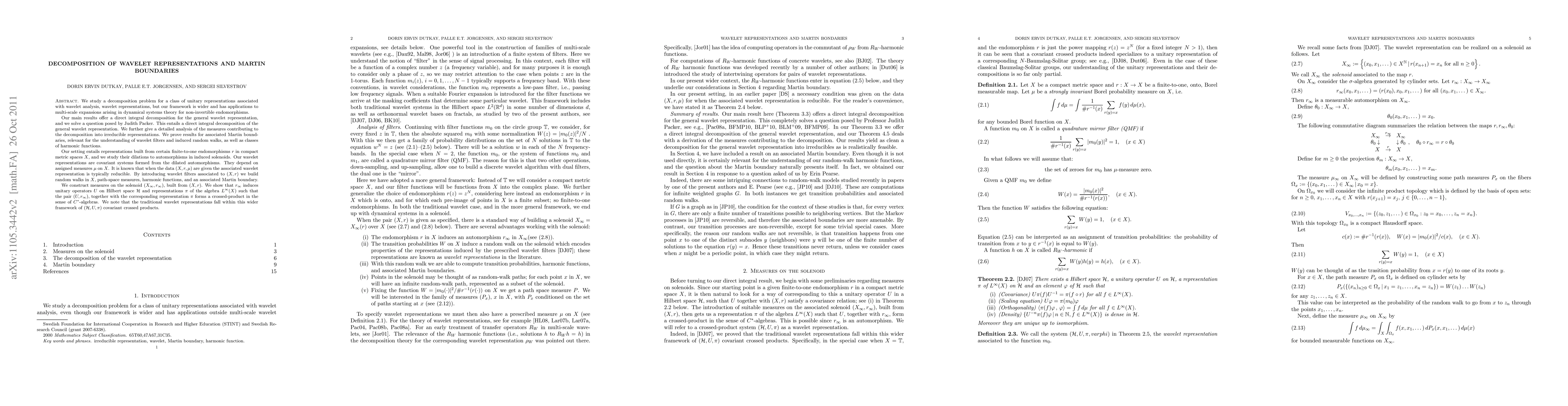 We study a decomposition problem for a class of unitary representations associated with wavelet analysis, wavelet representations, but our framework is wider and has applications to multi-scale expansions arising in dynamical systems theory for non-invertible endomorphisms. Our main results offer a direct integral decomposition for the general wavelet representation, and we solve a question posed by Judith Packer. This entails a direct integral decomposition of the general wavelet representation. We further give a detailed analysis of the measures contributing to the decomposition into irreducible representations. We prove results for associated Martin boundaries, relevant for the understanding of wavelet filters and induced random-walks, as well as classes of harmonic functions. Our setting entails representations built from certain finite-to-one endomorphisms $r$ in compact metric spaces $X$, and we study their dilations to automorphisms in induced solenoids. Our wavelet representations are covariant systems formed from the dilated automorphisms. They depend on assigned measures $\mu$ on $X$. It is known that when the data $(X, r, \mu)$ are given the associated wavelet representation is typically reducible. By introducing wavelet filters associated to $(X, r)$ we build random walks in $X$, path-space measures, harmonic functions, and an associated Martin boundary. We construct measures on the solenoid $(X_\infty, r_\infty)$, built from $(X, r)$. We show that $r_\infty$ induces unitary operators $U$ on Hilbert space $\H$ and representations $\pi$ of the algebra $L^\infty(X)$ such that the pair $(U, r_\infty)$, together with the corresponding representation $\pi$ forms a cross-product in the sense of $C^*$-algebras. We note that the traditional wavelet representations fall within this wider framework of $(\H, U, \pi)$ covariant crossed products.
