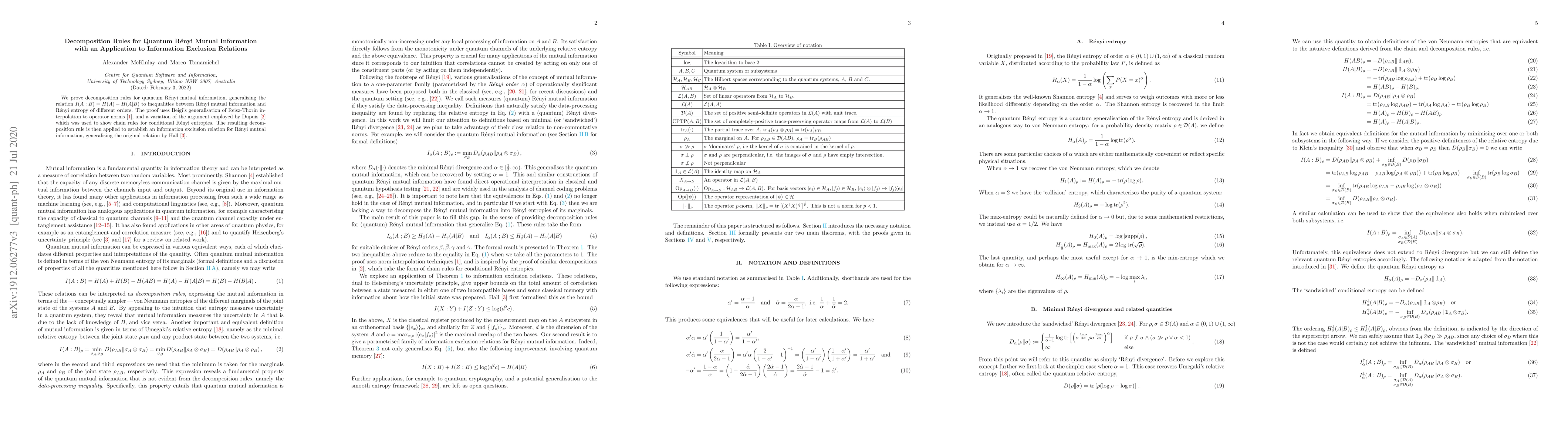 We prove decomposition rules for quantum R\'enyi mutual information, generalising the relation $I(A:B) = H(A) - H(A|B)$ to inequalities between R\'enyi mutual information and R\'enyi entropy of different orders. The proof uses Beigi's generalisation of Reisz-Thorin interpolation to operator norms, and a variation of the argument employed by Dupuis which was used to show chain rules for conditional R\'enyi entropies. The resulting decomposition rule is then applied to establish an information exclusion relation for R\'enyi mutual information, generalising the original relation by Hall.