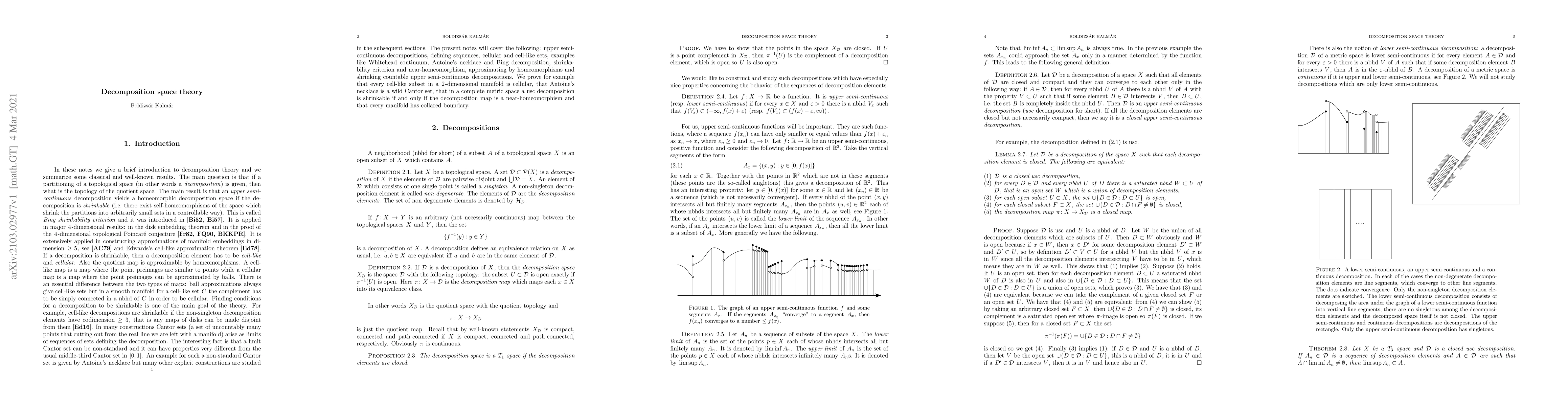 In these notes we give a brief introduction to decomposition theory and we summarize some classical and well-known results. The main question is that if a partitioning of a topological space (in other words a decomposition) is given, then what is the topology of the quotient space. The main result is that an upper semi-continuous decomposition yields a homeomorphic decomposition space if the decomposition is shrinkable (i.e. there exist self-homeomorphisms of the space which shrink the partitions into arbitrarily small sets in a controllable way). This is called Bing shrinkability criterion. It is applied in major 4-dimensional results: in the disk embedding theorem and in the proof of the 4-dimensional topological Poincare conjecture. It is extensively applied in constructing approximations of manifold embeddings in dimension at least 5, see for example Edwards's cell-like approximation theorem. We prove for example that every cell-like subset in a 2-dimensional manifold is cellular, that Antoine's necklace is a wild Cantor set, that in a complete metric space a usc decomposition is shrinkable if and only if the decomposition map is a near-homeomorphism and that every manifold has collared boundary.