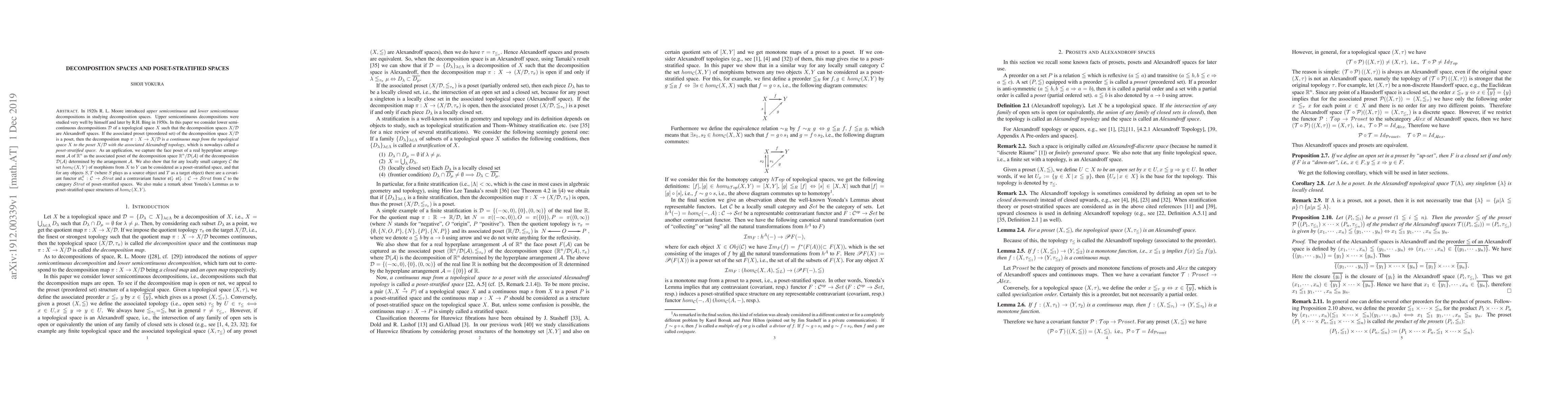 In 1920s R. L. Moore introduced \emph{upper semicontinuous} and \emph{lower semicontinuous} decompositions in studying decomposition spaces. Upper semicontinuous decompositions were studied very well by himself and later by R.H. Bing in 1950s. In this paper we consider lower semicontinuous decompositions $\mathcal D$ of a topological space $X$ such that the decomposition spaces $X/\mathcal D$ are Alexandroff spaces. If the associated proset (preordered set) of the decomposition space $X/\mathcal D$ is a poset, then the decomposition map $\pi:X \to X/\mathcal D$ is \emph{a continuous map from the topological space $X$ to the poset $X/\mathcal D$ with the associated Alexandroff topology}, which is nowadays called \emph{a poset-stratified space}. As an application, we capture the face poset of a real hyperplane arrangement $\mathcal A$ of $\mathbb R^n$ as the associated poset of the decomposition space $\mathbb R^n/\mathcal D(\mathcal A)$ of the decomposition $\mathcal D(\mathcal A)$ determined by the arrangement $\mathcal A$. We also show that for any locally small category $\mathcal C$ the set $hom_{\mathcal C}(X,Y)$ of morphisms from $X$ to $Y$ can be considered as a poset-stratified space, and that for any objects $S, T$ (where $S$ plays as a source object and $T$ as a target object) there are a covariant functor $\frak {st}^S_*: \mathcal C \to \mathcal Strat$ and a contravariant functor $\frak {st}^*_T$ $\frak {st}^*_T: \mathcal C \to \mathcal Strat$ from $\mathcal C$ to the category $\mathcal Strat$ of poset-stratified spaces. We also make a remark about Yoneda's Lemmas as to poset-stratified space structures of $hom_{\mathcal C}(X,Y)$.