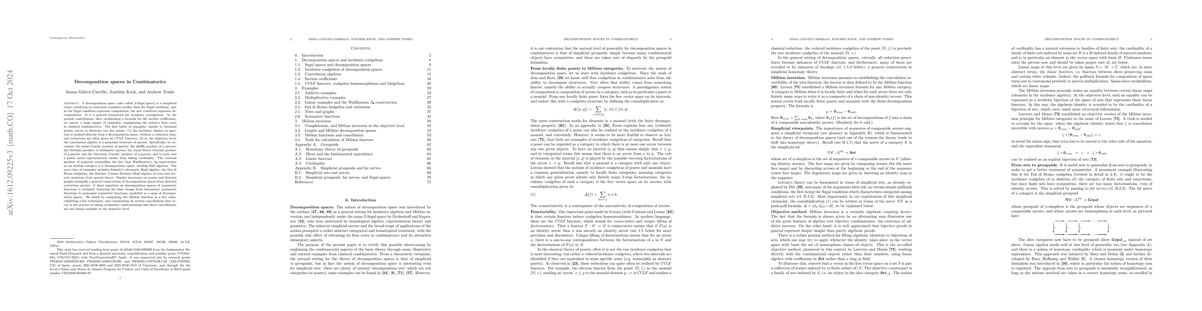 A decomposition space (also called unital 2-Segal space) is a simplicial object satisfying an exactness condition weaker than the Segal condition: just as the Segal condition expresses (up to homotopy) composition, the new condition expresses decomposition. It is a general framework for incidence (co)algebras. In the present contribution, after establishing a formula for the section coefficients, we survey a large supply of examples, emphasising the notion's firm roots in classical combinatorics. The first batch of examples, similar to binomial posets, serves to illustrate two key points: (1) the incidence algebra in question is realised directly from a decomposition space, without a reduction step, and reductions are often given by CULF functors; (2) at the objective level, the convolution algebra is a monoidal structure of species. Specifically, we encounter the usual Cauchy product of species, the shuffle product of L-species, the Dirichlet product of arithmetic species, the Joyal-Street external product of q-species and the Morrison `Cauchy' product of q-species, and in each case a power series representation results from taking cardinality. The external product of q-species exemplifies the fact that Waldhausen's S-construction on an abelian category is a decomposition space, yielding Hall algebras. The next class of examples includes Schmitt's chromatic Hopf algebra, the Fa\`a di Bruno bialgebra, the Butcher-Connes-Kreimer Hopf algebra of trees and several variations from operad theory. Similar structures on posets and directed graphs exemplify a general construction of decomposition spaces from directed restriction species. We finish by computing the M\"obius function in a few cases, and commenting on certain cancellations that occur in the process of taking cardinality, substantiating that these cancellations are not possible at the objective level.