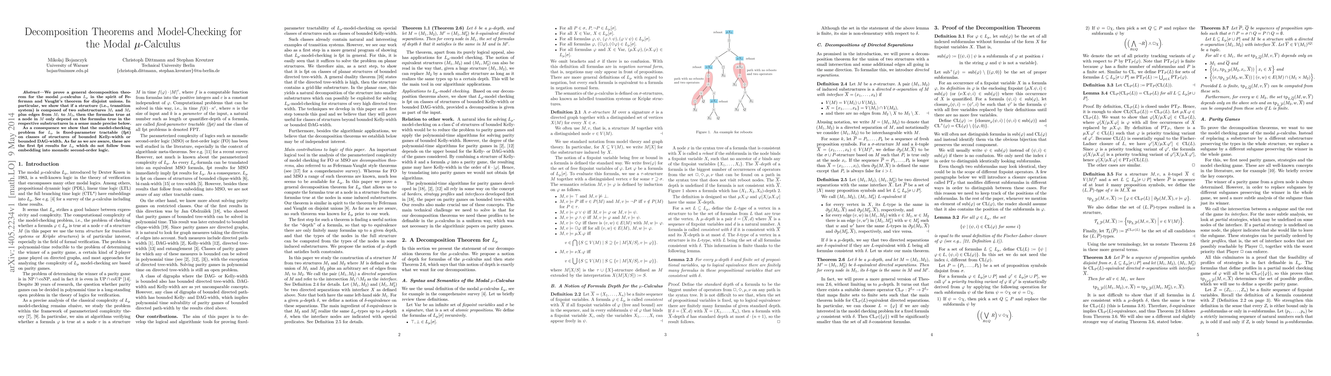 This paper establishes a decomposition theorem for the modal $\mu$-calculus $L_\mu$, demonstrating that model formulas depend only on substructures within a transition system. It also shows that model-checking for $L_\mu$ is fixed-parameter tractable for structures with bounded Kelly-width or DAG-width, marking the first such results not derived from embeddings into monadic second-order logic.