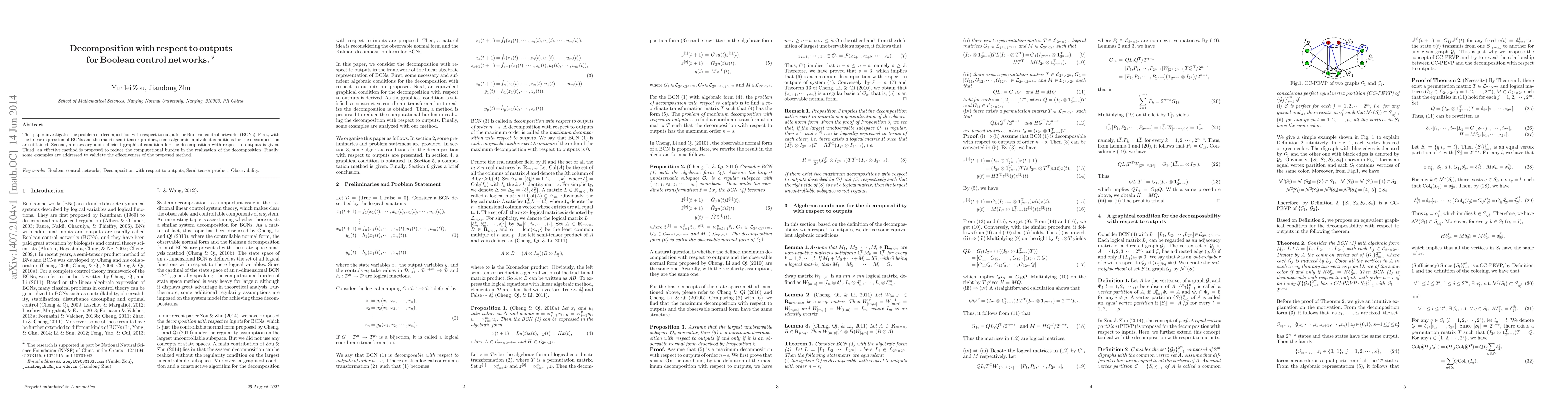 This paper investigates the problem of decomposition with respect to outputs for Boolean control networks (BCNs). First, with the linear expression of BCNs and the matrix semi-tensor product, some algebraic equivalent conditions for the decomposition are obtained. Second, a necessary and sufficient graphical condition for the decomposition with respect to outputs is given. Third, an effective method is proposed to reduce the computational burden in the realization of the decomposition. Finally, some examples are addressed to validate the effectiveness of the proposed method.
