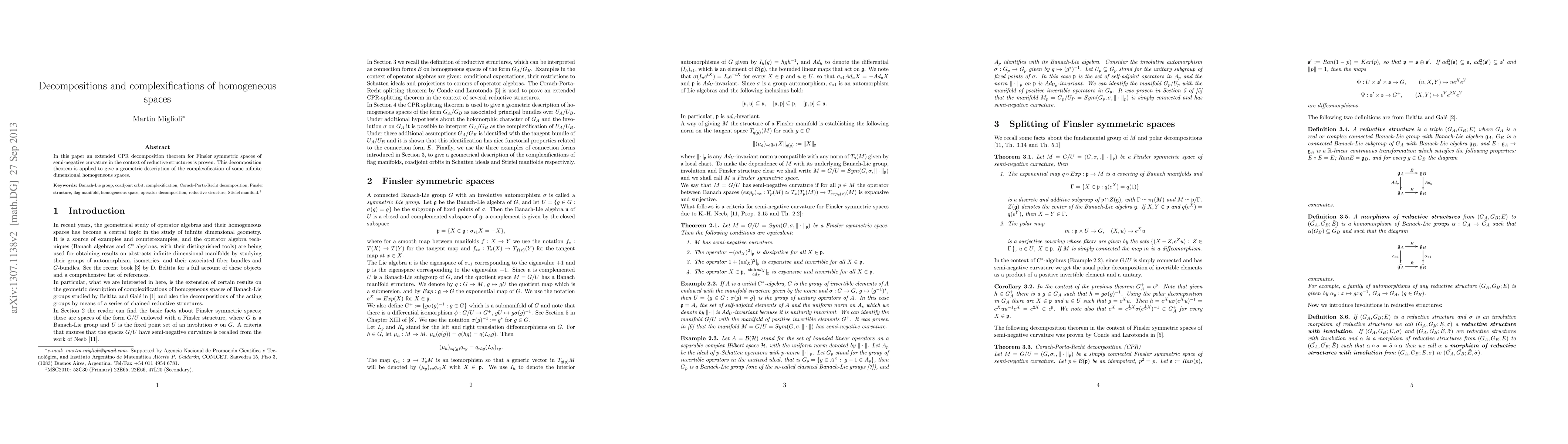 In this paper an extended CPR decomposition theorem for Finsler symmetric spaces of semi-negative curvature in the context of reductive structures is proven. This decomposition theorem is applied to give a geometric description of the complexification of some infinite dimensional homogeneous spaces.