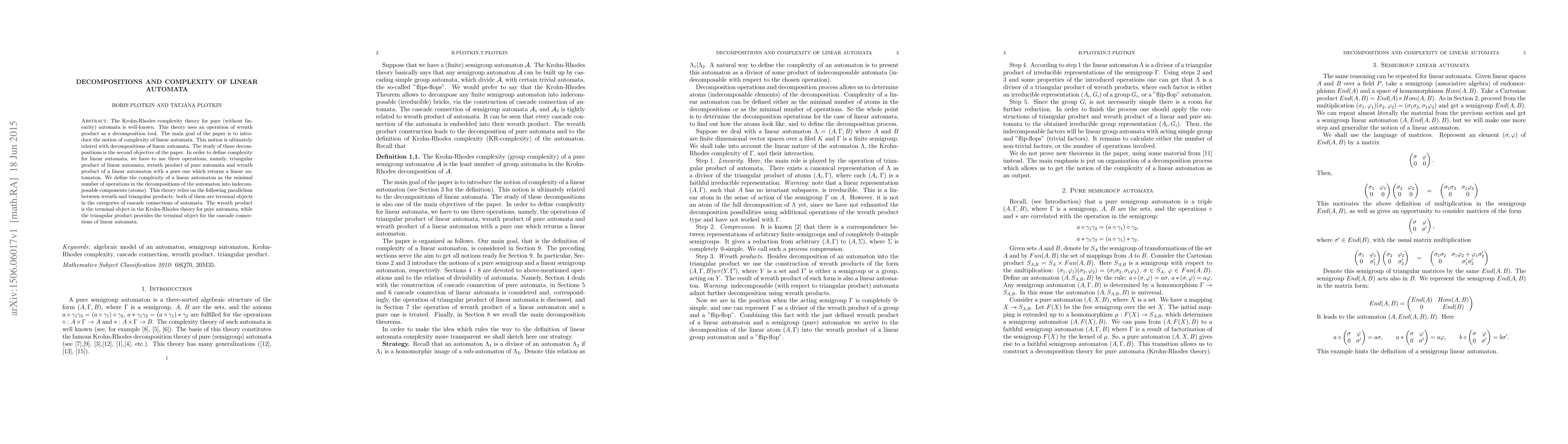 This paper introduces a complexity theory for linear automata, defining it as the minimal number of operations needed to decompose an automaton into indecomposable components. It relies on parallelism between wreath and triangular products of automata.