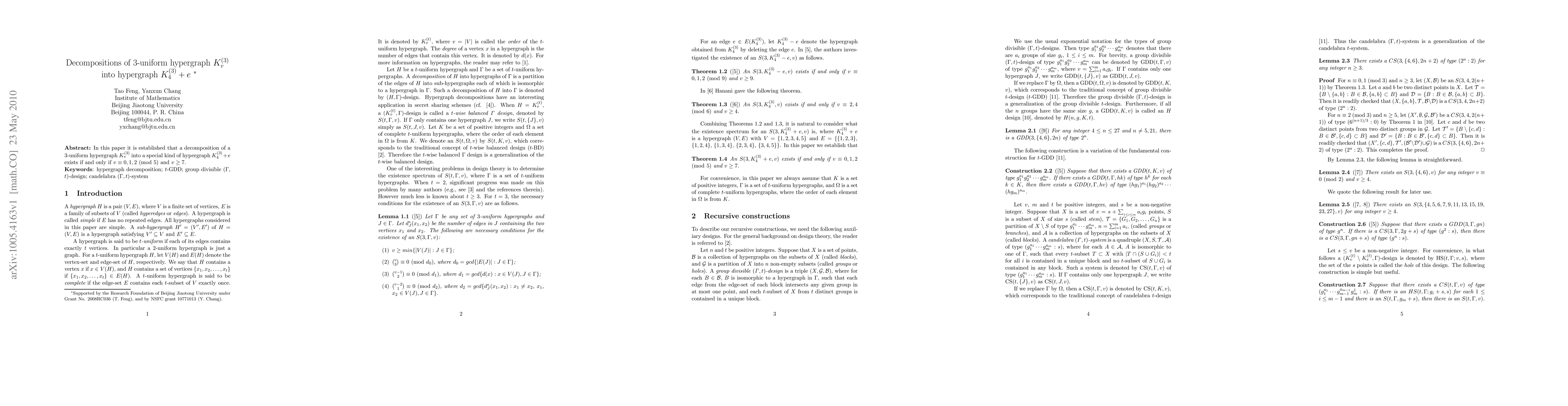 This paper proves that a 3-uniform hypergraph K_v^{(3)} can be decomposed into the hypergraph K_4^{(3)}+e if and only if v is congruent to 0, 1, or 2 modulo 5 and v is greater than or equal to 7.