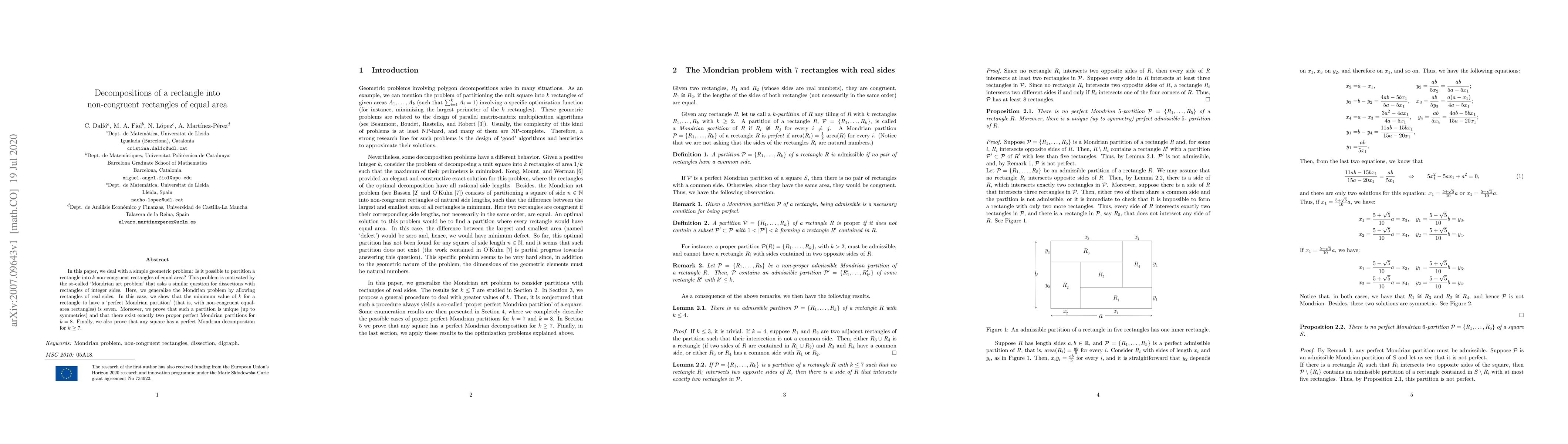 This paper explores the geometric decomposition of rectangles into non-congruent rectangles of equal area, generalizing the Mondrian art problem. It finds that the minimum number of such rectangles required is seven, with a unique partition, and two for eight pieces. Additionally, it proves that any square can be decomposed perfectly for seven or more pieces.