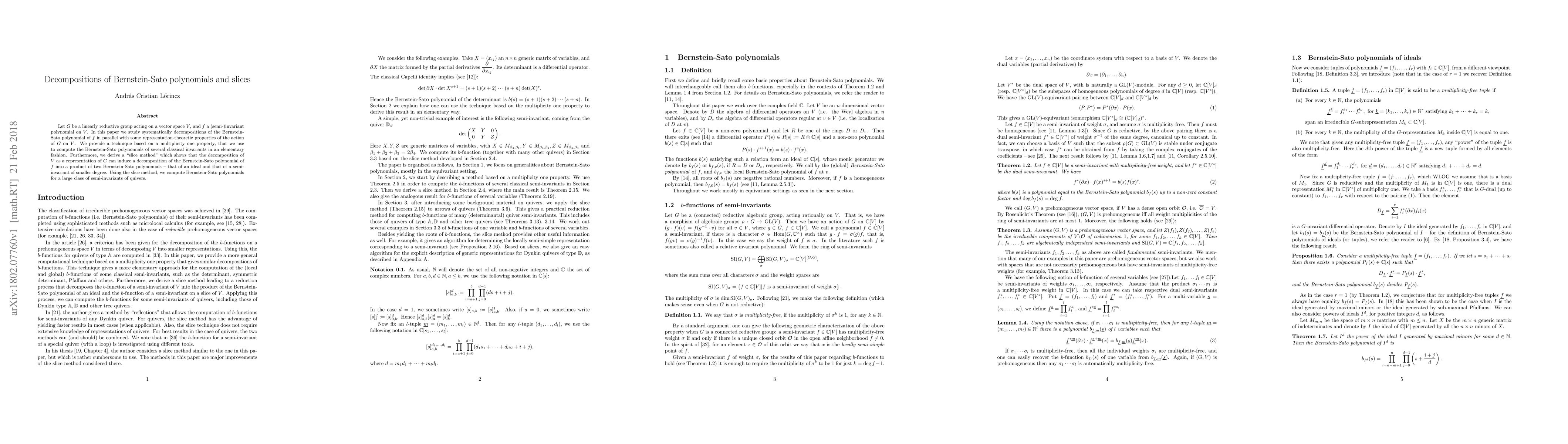 This paper explores decompositions of Bernstein-Sato polynomials for (semi-)invariant polynomials under a linearly reductive group action, leveraging a multiplicity one property to compute these polynomials. It introduces a "slice method" to decompose the polynomial based on the representation-theoretic properties of the group action, and applies this method to compute Bernstein-Sato polynomials for semi-invariants of quivers.