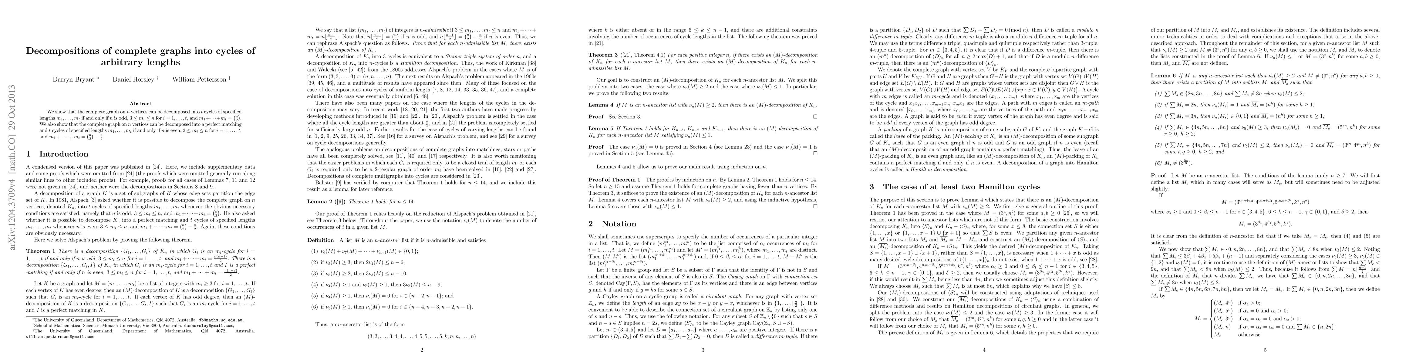 Research proves that a complete graph can be decomposed into cycles of arbitrary lengths under specific conditions for odd and even number of vertices, with constraints on cycle lengths and total edge count.