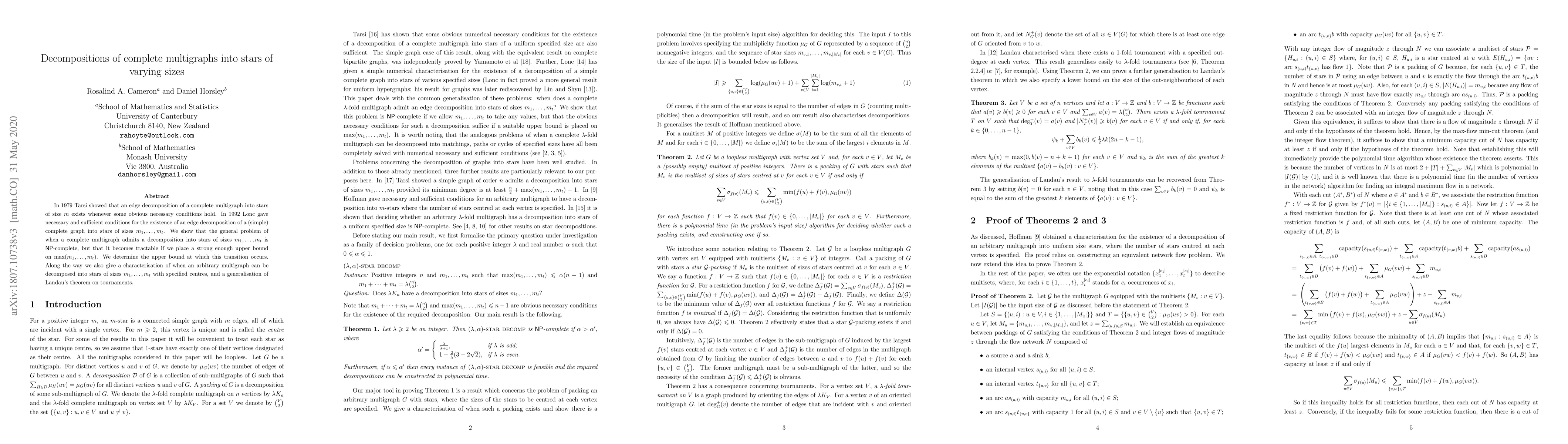 This paper proves that decomposing a complete multigraph into stars of varying sizes is $\mathsf{NP}$-complete but becomes tractable with a sufficiently large upper bound on the maximum star size. It also characterizes such decompositions for arbitrary multigraphs and generalizes Landau's theorem on tournaments.