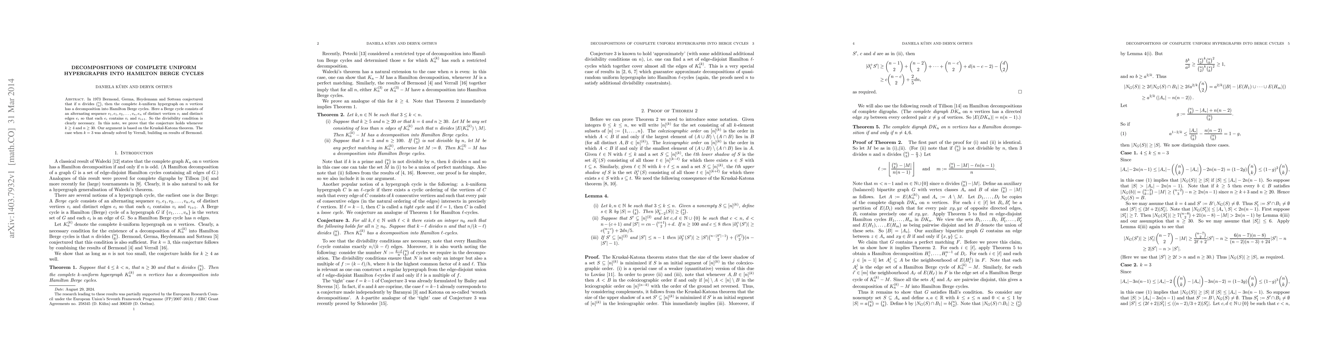 This paper proves the Bermond-Germa-Heydemann-Sotteau conjecture that complete $k$-uniform hypergraphs on $n$ vertices can be decomposed into Hamilton Berge cycles when $n$ divides $\binom{n}{k}$, specifically for $k \ge 4$ and $n \ge 30$, using the Kruskal-Katona theorem. The case for $k=3$ was previously resolved by Verrall.