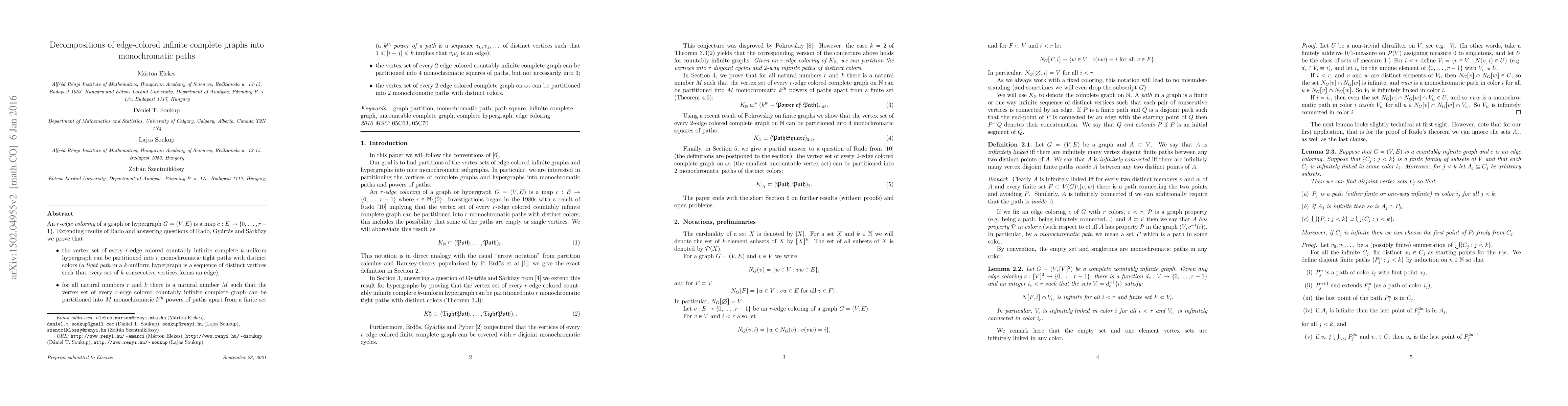 An $r$-edge coloring of a graph or hypergraph $G=(V,E)$ is a map $c:E\to \{0, \dots, r-1\}$. Extending results of Rado and answering questions of Rado, Gy\'arf\'as and S\'ark\"ozy we prove that (1.) the vertex set of every $r$-edge colored countably infinite complete $k$-uniform hypergraph can be partitioned into $r$ monochromatic tight paths with distinct colors (a tight path in a $k$-uniform hypergraph is a sequence of distinct vertices such that every set of $k$ consecutive vertices forms an edge), (2.) for all natural numbers $r$ and $k$ there is a natural number $M$ such that the vertex set of every $r$-edge colored countably infinite complete graph can be partitioned into $M$ monochromatic $k^{th}$ powers of paths apart from a finite set (a $k^{th}$ power of a path is a sequence $v_0, v_1, \dots$ of distinct vertices such that $1\le|i-j| \le k$ implies that $v_iv_j$ is an edge), (3.) the vertex set of every $2$-edge colored countably infinite complete graph can be partitioned into $4$ monochromatic squares of paths, but not necessarily into $3$, (4.) the vertex set of every $2$-edge colored complete graph on $\omega_1$ can be partitioned into $2$ monochromatic paths with distinct colors.