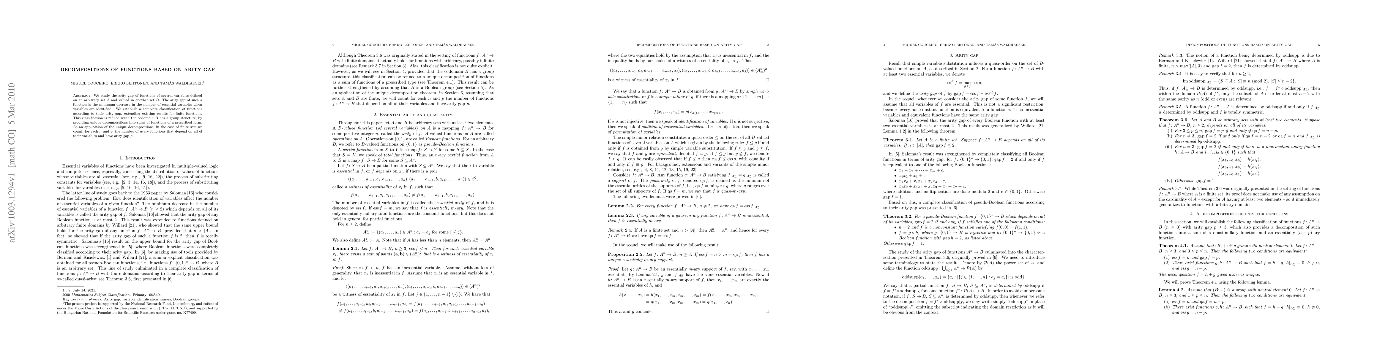 This paper classifies functions based on their arity gap, which measures the minimum reduction in essential variables when some are identified. It provides unique decompositions for functions with group-structured codomains and counts n-ary functions with specific arity gaps for finite sets.