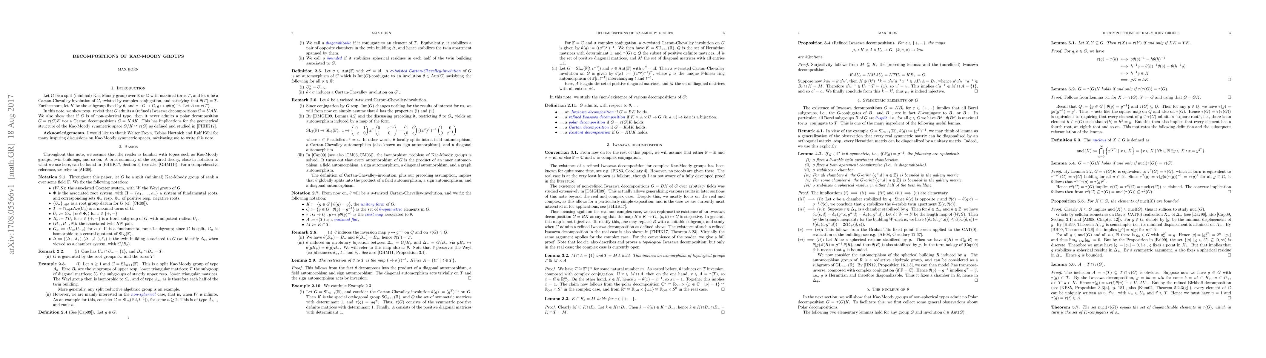 Let $G$ be a split (minimal) Kac-Moody group over $\mathbb{R}$ or $\mathbb{C}$ with maximal torus $T$, and let $\theta$ be a Cartan-Chevalley involution of $G$, twisted by complex conjugation, and satisfying that $\theta(T)=T$. Furthermore, let $K$ be the subgroup fixed by $\theta$, and $\tau:G\to G, g\mapsto g\theta(g)^{-1}$. Let $A:=\tau(T)$. In this note, we show resp. revisit that $G$ admits a (refined) Iwasawa decompositions $G=UAK$. We also show that if $G$ is of non-spherical type, then it never admits a polar decomposition $G=\tau(G)K$ nor a Cartan decompositions $G=KAK$. This has implications for the geometrical structure of the Kac-Moody symmetric space $G/K \cong \tau(G)$.