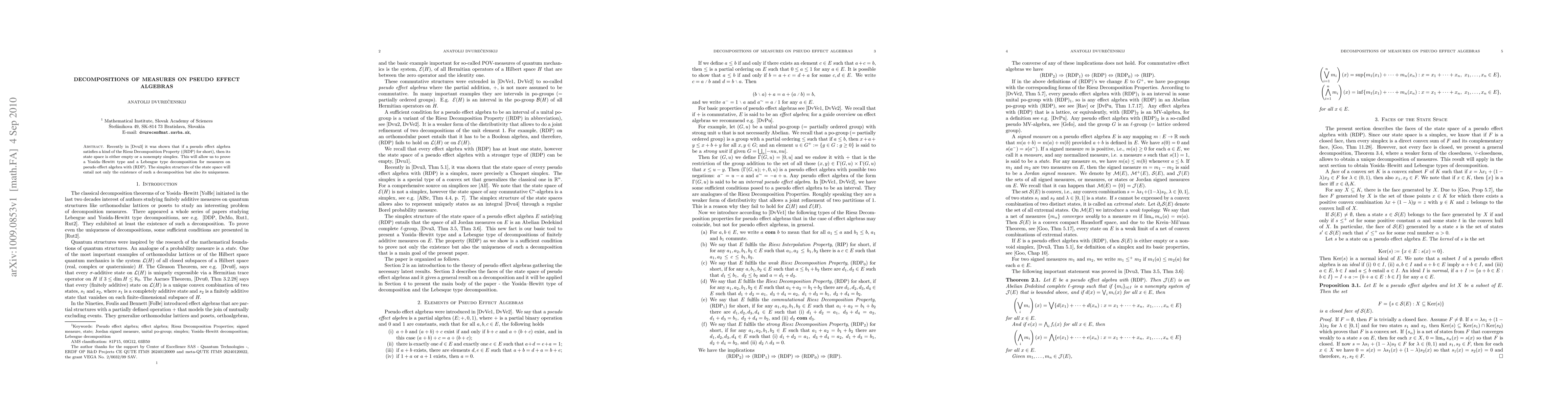 This paper proves Yosida-Hewitt and Lebesgue type decompositions for measures on a pseudo effect algebra satisfying the Riesz Decomposition Property, showing that the state space is either empty or a simplex, which guarantees both existence and uniqueness of the decomposition.